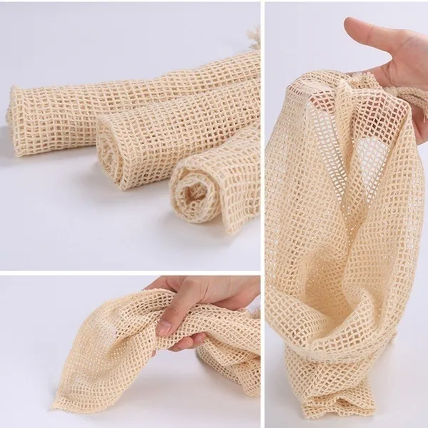 Product Size: Small 20*28cm/8*11in Medium 33*28cm/13*11in Large size 43*28cm/17*11in Material: cotton mesh + cotton rope Uses:storage, shopping Type :Vegetable Kitchen Storage Bag Theme :Home, Garden Package included: 1Pcs(S/M/L) Or 3Pcs(1Pcs-S +1Pcs-M +1Pcs-L) * Storage Bag