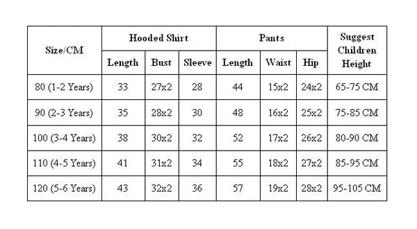 100% Brand New&Good Quality Product: Boys Clothes Sleeves: Long Sleeve Material: Cotton Blend&Polyester Size: 80 90 100 110 120 suits for 1-6 years Please check our detailed size chart, 1 CM=0.39 INCH. Attention: - Manual size measurements, please allow 1-3 CM differs. - Color may be little different due to monitor, thank you. Package Included:1 x Outfits(Top+Pants)