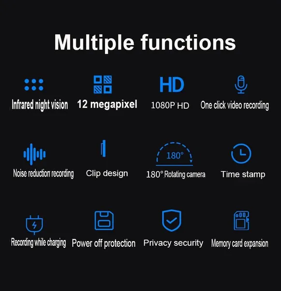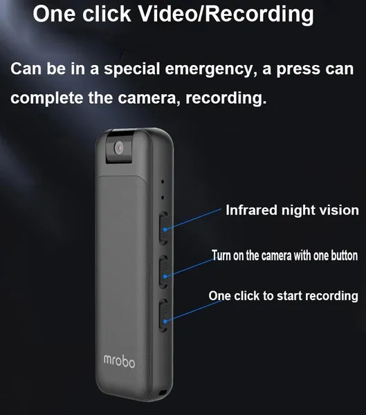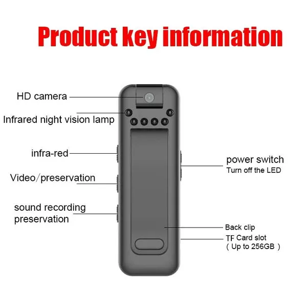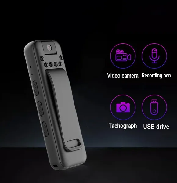 Features 1 video recording 2 MP3 function 3 1080P HD 4 back clip design 5 180 degree rotating lens 6 OLED display 7 Supports external playback, and supports headset playback Parameters Video format: AVI Image coding: M-JPEG Video resolution: 1920x1080p 30fbs; 1280x720p 30fbs Audio format: WAV Music support: MP3 Support system: WINDOWS XP/7/VISTA/8/10; MAX OSX 10.4 or above; LINUX Battery type: high capacity polymer lithium battery, capacity 700MAH Working time: Recording for about 4 hours, recording for about 8 hours Size and weight: 82X26.5X14.4MM; 38.5G Storage support: CLASS 4 or above SDHC, SDXC (support 256G) MICRO SD card (Note: Please format the new card to FAT32 format, the allocation unit size is 32KB. It is larger than 32GB. The card needs to use a third-party formatting tool) Charging voltage: DV 5V/-500MAH Light source frequency: 50HZ/60HZ Interface media: MICRO 5 PIN USB Packing accessories: 1xpen camera 1xmanual 1xUSB cable