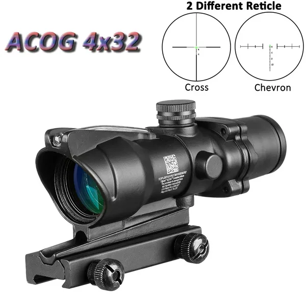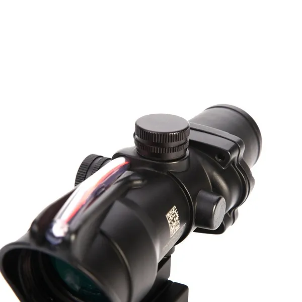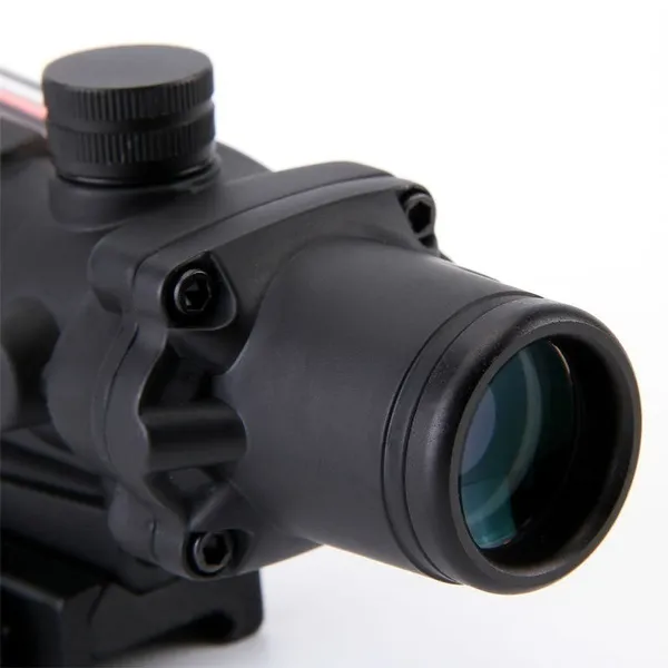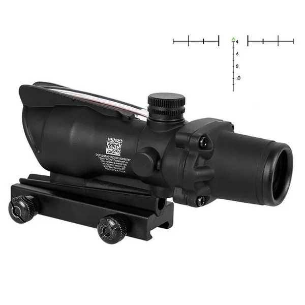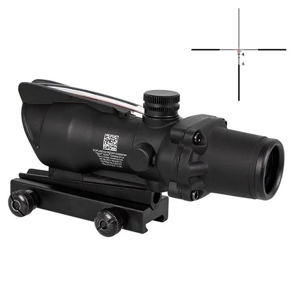 ACOG 4x32 Hunting Riflescope Red Illuminated Optical Fiber Rifle scope Specification: 4X32 Up to 600 meter 5.56/.223 Red illuminated (at day light only) BDC reticle Powered by fiber source, providing more bright environment and reticle illumination at day. There is no on/off switch on a red dot, but due to light sensor Adjustable windage and elevation Multi-coated front lens. Easily installed on any 20 mm Picatinny rail. Objective diameter: 32 mm Magnification: ACOG - 4X Eye relief: 1.5" Combined Weight: 460g
