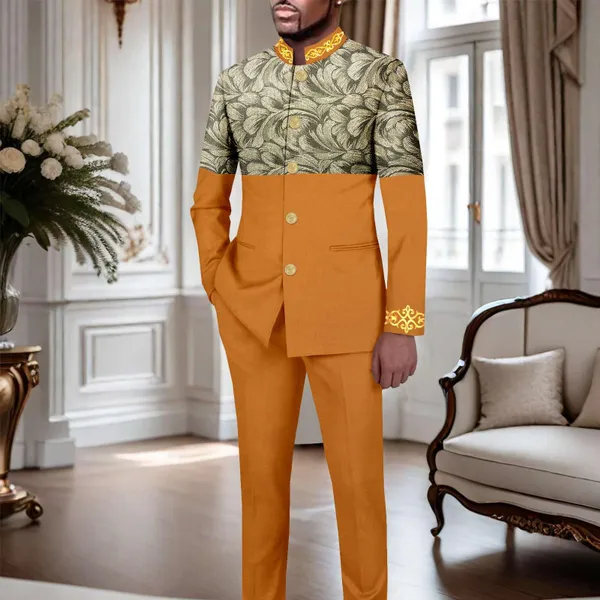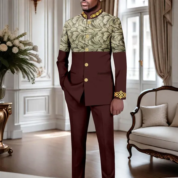 African Suits for Men Slim Fit Embroidery Single Breasted Full Sleeve Printed Blazer and Pants Set Formal Outfits