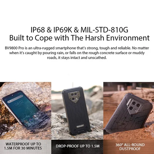 Blackview BV9800 Pro Smartphone Helio P70 6GB+128GB Android 9.0 Cellphone 6580mAh Thermal Imagery 48MP+5MP Rear Cameras Waterproof Mobile Phone