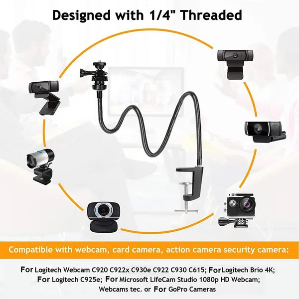 <p>100% brand new and high quality Features: The mini tripod head can be adjusted 360 degrees to obtain different optimal angles. The jaws of the fixture are suitable for desks, tables, sideboards, and beds with a maximum thickness of 5.2 cm (2 inches). The 1/4"adapter is suitable for all 1/4 "screw web cameras, such as camera for Webcam Brio 4K, C925e, C922x, C922, C930e, C930, C920, C615. With a gooseneck, the camera stand can extend up to about 13.3 inches; the maximum load weight is about 0.5 kg (1.1 lbs). It is recommended to install the jaw bending fixture on a stable fixed object, not on a vibrating object, otherwise it is difficult to maintain high-quality image effects. Camera Bracket only, other accessories demo in the picture is not included! Specification: Material: ABS + Metal Length: app.34 cm / 13.3in Maximum load weight: about 0.5 kg (1.1 lb) Color: Black Quantity: 1 Set Note: Please allow 0-1cm error due to manual measurement. pls make sure you do not mind before you bid. Due to the difference between different monitors, the picture may not reflect the actual color of the item. Thank you! Package includes: