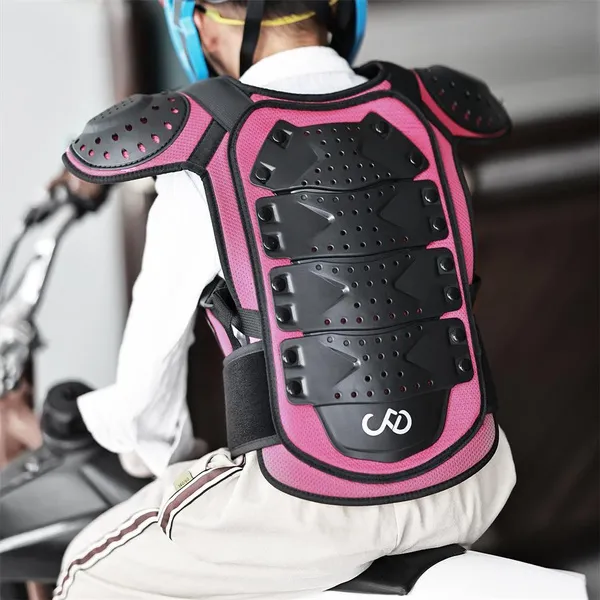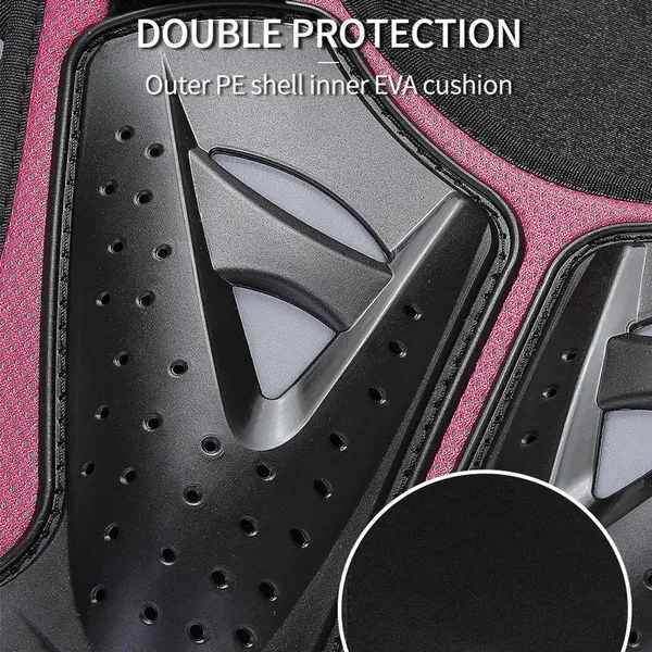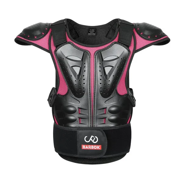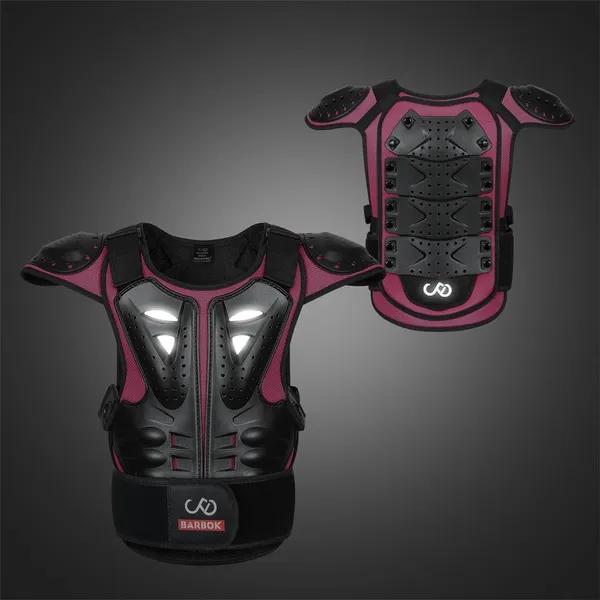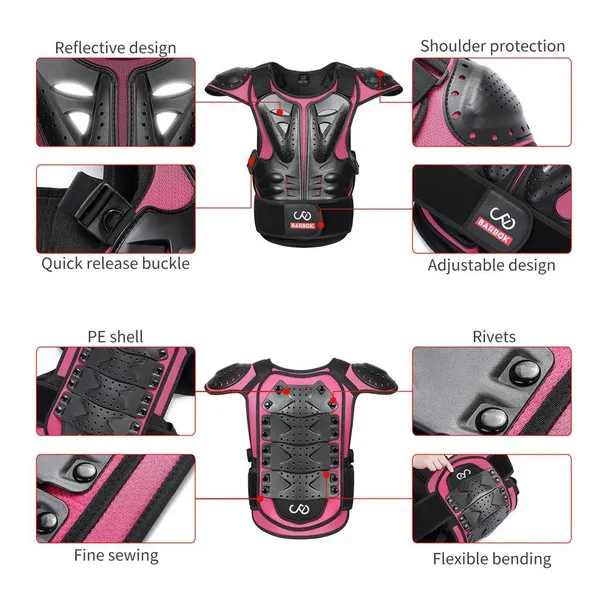 Kids Body Armor Black, Rose S (height 100-120cm, waist 60-75cm, three pieces of armor at back) M (height 120-145cm, waist 70-80cm, four pieces of armor at back) L (height 145-160cm, waist 75-90cm, five pieces of armor at back) Fine wrapping around the collar Armor overall EVA filling, surface mesh design PE shell protection on shoulders, front chest and back, multiple small holes in the shell Plain fabric lining, soft and comfortable PE shell on the front chest built-in reflective cloth, night riding safety Detachable front and back armor, controlled by double Hook&Loop at shoulders and quick release buckle at waist The waist buckle press to pull out Hook&Loop on the shoulders and straps on both sides of the waist to adjust the tightness Sticky surface waist protection design to adjust the waist elasticity Waist guard with BARBOK leather logo not reflective, reflective logo at the bottom of the back Fit for children and teenagers Suitable for motorbike, cycling, roller, skateboarding, skiing, skating, etc