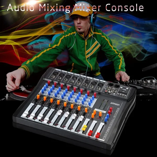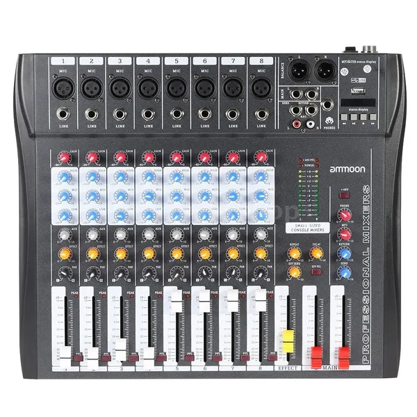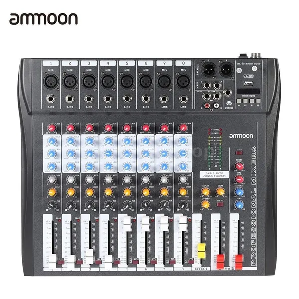 In some cases, there will be VAT or other taxes, customs duties or fees levied by your destination country. Additional charges for taxes or customs clearance must be borne by the recipient; we have no control over these charges and cannot predict what they may be. If you don't want the product to be delivered by Express, please kindly leave us a message. Thank you. Note: This product will be shipped with adapter according to your country. Features: 8 channels mixing console with XLR, LINE inputs and 48V phantom power. Each channel has GAIN, 3-band EQ, AUX, EFFECT, PAN control knobs and volume control faders. The PEL switch allow you to monitor the channel that the PEL is turned "ON" only. AUX send & return jacks for connecting all kinds of effects from outside. With XLR (L/ R) & 1/4" (L/ R) stereo output jacks and REC (L/ R) & headset interfaces. With USB input interface and LCD display as well as control buttons. With power and output level indicator lights for easy monitoring and operation. EFFECT level and output MAIN faders, REPEAT, EFF SEND, DELAY, SEND, RETURN knobs on the master section. Great for Recording DJ Stage Karaoke to have a perfect sound effects. Specifications: Brand: ammoon Model: 80S-USB Color: Black Material: Metal Power adapter: EU Plug Input: 100-240V AC 50/60Hz 0.23A Output: ±15V DC ﹢48V DC Item size: Approx. 40 * 34 * 4cm / 15.7 * 13.4 * 1.6in Item weight: 3.7kg / 8.2lb Package size: 45 * 42 * 10cm / 17.7 * 16.5 * 3.9in Package weight: 4.4kg / 9.7lb Package List: 1 * Mixing Console 1 * Power Adapter (EU) 1 * User Manual (English)