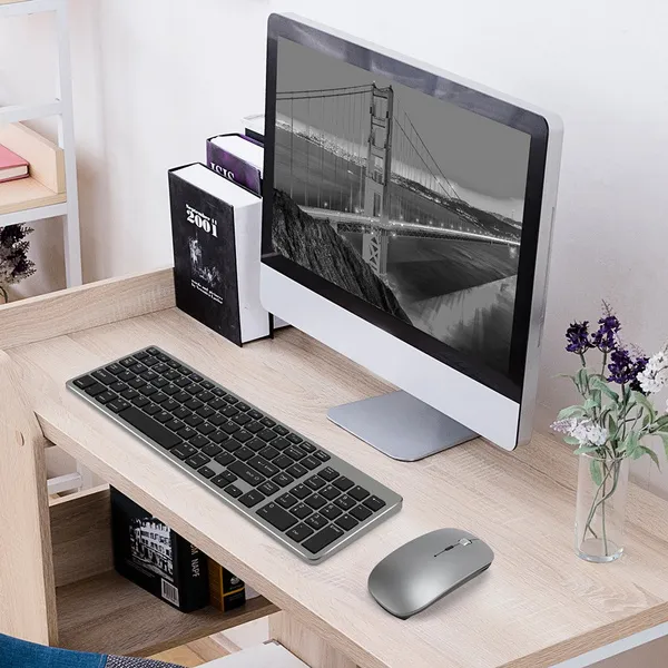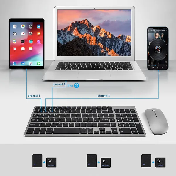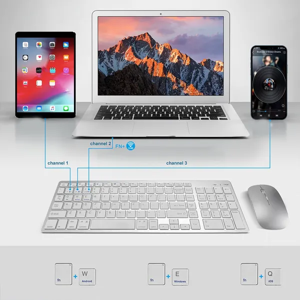 <p>Ultra-thin Wireless Dual-mode Keyboard &amp;Mouse Combo Sleek Design RGB Sleek Design Silent Wireless Office Mechanical Features: 100% brand new and high quality Bluetooth-compatible &amp; 2.4g Wireless Connection: 2.4g Wireless technology provides stable connection. One plug and play 2.4g USB receiver or via Bluetooth-compatible can connect both the keyboard, ensures a stable and reliable connection. Function Across Three Devices - Both keyboard and mouse are dual-mode designed and three channels enabled. Broad Compatibility: Widely Compatible with Androids, Windows, and Mac systems. Windows 8/ 10 or above; Androids 5.0 or above; Mac 10.10 or above; iOs 10.13.4 or above. Rechargeable and Energy Saving: Built-in rechargeable 280mAh lithium battery, this keyboard and mouse combo can be easily charged with included micro charging cable. Comfortable &amp; Precise Typing: Low profile keys, a scissor mechanism beneath each key allows for increased stability, silent to press and rebound quickly. Specification: Connect method: Bluetooth-compatible 3.0,Bluetooth-compatible 5.0,2.4g Keyboard Dimensions: approx. 36.57x11.89x0.58cm/ 14.4 x 4.68x0.23inch Mouse Dimensions: approx. 11.5x5.8x2cm/4.4x2.3x0.8inch Mouse Photoelectric resolution: 3 adjustable dpi level (1000 / 1200 / 1600dpi) Charge time: about 2 hours Keys life: 3milion clicks Package Includes: 1 x Keyboard and 1xMouse 1 x Charging Cable 1 x User manual note: This keyboard is not fully compatible with Mac Os systems, the multimedia keys are not fully compatible with Mac Os systems Due to the lighting effects and shooting angles, there is color difference in the product, please understand. Due to manual measurement, there is a tolerance in the product size. </p>