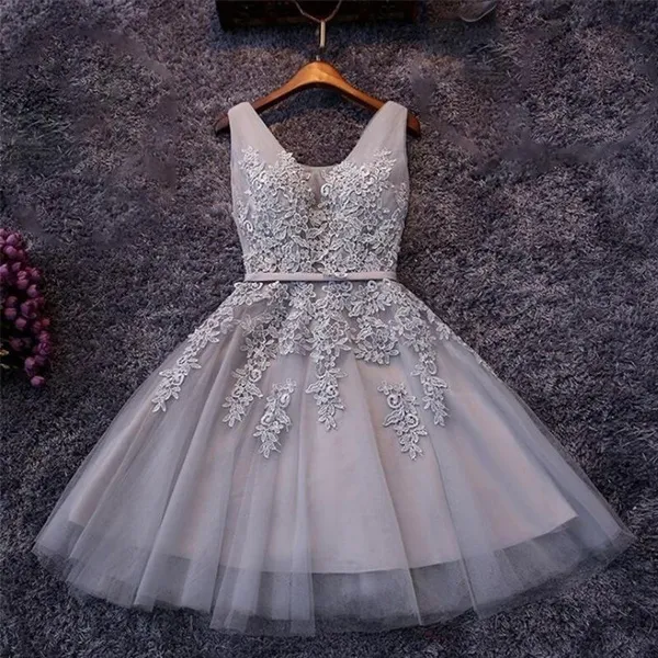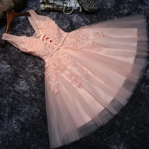 Dresses Length : Knee-Length Neckline : V-Neck Sleeve Length(cm) : Sleeveless Actual Images : Yes Item Type : Prom Dresses Fabric Type : Tulle Fashion Element : Floral Print Built-in Bra : Yes Waistline : Natural Decoration : Beading\Appliques Material : Polyester Silhouette : A-Line Occasion : Prom