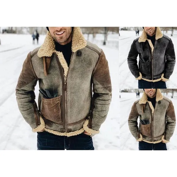 Faux Leather Plush Men's Jacket Winter Insulation Jacket with Thickened Lapel and Contrasting Colors