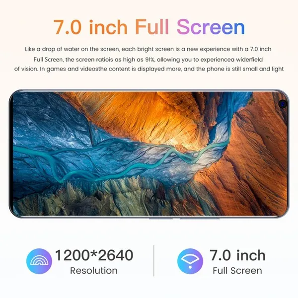 Free gift:1x256GB TF Card Note: It is not compatible with US direct phone, Sprint and Verizon operators! Feature: - 7.0inch Left digging scree The X50 Pro+ delivers the viewingexperience you always wanted, With a massive 90% screen-to-body ratio on a 7.0"inch screen - 24MP Front CameraClear and Stylish Selfies The X50 Pro+ world-leading 24MP front camera turnsyour every selfe into a work of art Experience greaterbrightness, color vibrancy, clarity and dynamic range.even in the dimmest light, Whenever you needit. your X50 Pro+ is right there with you, capturing everymoment with crystal-clear precision, Turn your selfiesinto masterpieces and shine in every photo -Rear Ultra HD camera The X50 Pro+ features a 48MP camera combination. The main camera sportsa large f/1.8 aperture and 1.28um pixels, This strong combination boosts photosensitibityin backlight or low light, Just point and shoot, and X50 Pro+ will makesure your pictures remain clear and bright - Face Access The X50 Pro+ also supports facial recognitionUpon activation, X50 Pro+ scans your facial features and unlocks instaneouslyAccessing your phone has never been so easy, or so fun - Powerful Performance The MTK6889 mobile platform with 7mm process technology makesyoung people who love the young and stiand other popular games.The game ison and lower - Android 10.0 The new interactive design makes the operation simple and simple, the use of themobile phone is so simple and straightforward, everything is handy - Dual SIM card + TF card Dual card dual standby, no difference between the main and auxiliary bayonet ports, supports the network of 50 major communication operators in the world, and supports the installation of memory cards to make your storage space more abundant and a better experience. Specification:Factory direct sales, better quality but lower price is our target and mission! Model No.: X50 Pro+ CPU: MTK6889 Deca Core (Latest 10 Core) SIM/TF: 2 SIM Card Slots (Nano SIM) + 1 TF Card Slots (Maximum support extension 256GB) Screen: 7.0 Inch left digging screen Resolution :1200*2640 Camera: Front Camera 24MP+ Rear Camera 48MP Memory: 12GB RAM+512GB ROM System: Android 10.0 System Battery: 5500mAh High Density Lithium-ion battery Unique Back Cover: Thermally curved AG glass back cover.. It is art, it is also technology! Net-Work: GSM850/900/1800/1900MHz, 3G: WCDMA850/1900/2100MHz, 4G,5G Vibration:Support Multi Media: MP3/MP4/3GP/FM Radio/Bluetooth Multi Function: Full screen, Face recognition,Screen fingerprint, Dual SIM, Wifi, GPS, Gravity Sensor, Alarm ,Calendar,Calculator,Audio recorder ,Video recorder, WAP/MMS/GPR, Image viewer,E-Book,World clock Languages: Multi-language support Attention: 1.Due to the difference in light, the actual color of the phone may be slightly different from the screen and the picture. Color names are only used to distinguish between individual SKUs. Please understand that. Thank you. 2.The battery capacity is typical of the factory laboratory, the specific charging speed, the length of use and other data, the actual situation will be slightly different due to the power cord, power adapter, ambient temperature. When the phone is completely out of power and automatically shuts down, you need to charge your phone for more than 30 minutes to boot. It is recommended to charge when the battery is less than 20% charged. 3.Available memory capacity is subject to preloaded software 4.Product images and models, data, functions, performance, specifications, etc. are for reference only.We may improve the above contents. For details, please refer to the product and product description. Unless otherwise stated, the data contained in this website are our internal test results, and the comparisons are compared with our products. 5.The mobile phone does not support the telecom CDMA network (For example US Sprint and Verizon operators) Package Included: 1 x Smartphone, 1 x Charger Adapter 1x Date Cable 1 x Headphones, 1 x User Manual 1 x Phone Case 1 x Protection film