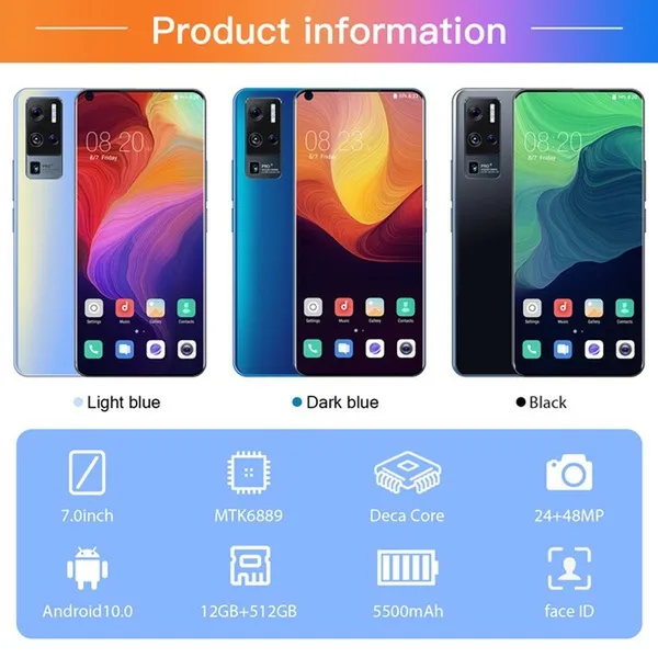 Halloween Gift for 2020 New X50 Pro + Smartphone, with 12GB + 512GB Large Memory, 7.0-inch Left Digging Screen, Face Unlock 5G Three-card Lock-free Mobile Phone