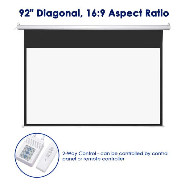 Features: - Wall & Celling Mount - 92" diagonal, 16:9 Electric Motorized Projector Screen, can be remote controlled to roll up or down to enjoy visual fun at ease, and retracted into the casing without taking up much space when not used, perfect for home theater movies projection and business presentation - Automatic Down & Play - Effortlessly extending the screen from small to very large sizes by control panel or remote controller from the comfort of your couch, meeting your demands in any kind of space; Copper motor allows silent operation with extended operational longevity - 2-Way Installation & Easy Operation - Feature metal rings for flexible installation to wall or celling for your selection without considering space limits; Plug and play, easy to use just with a push of the button - Screen for Better Performance - Made of PVC material, matte white viewing surface diffuses projected light uniformly, providing 160 degree large viewing angle; 4 side black masking borders increase picture focus & contrast - Wide Application - Ideal for indoor use, you can watch movie at home at weekend, or enjoy football game at restaurant & bar, also for meeting room, classroom; Suitable for front projection Specifications: - Unfolded Overall Dimension(LxW): 90 15/16" x 60 5/8" (231 x 154 cm) - Viewing Area Size(WxH): 79 15/16" x 44 7/8" (203 x 114 cm) - Diagonal: 92" (233.7 cm) - Aspect Ratio: 16:9 - Viewing Angle: 160 Degree - Gain: 1.3 - Projection Type: Front Projection - Voltage: 110 V, 60 Hz - Power: 38 W - Net Weight: 16.5 Lbs (7.5 kg) Package Contents: - 1x Electric Projector Screen - 1x Remote Control (Battery not included) - 1 Set of Screws - 1x Manual