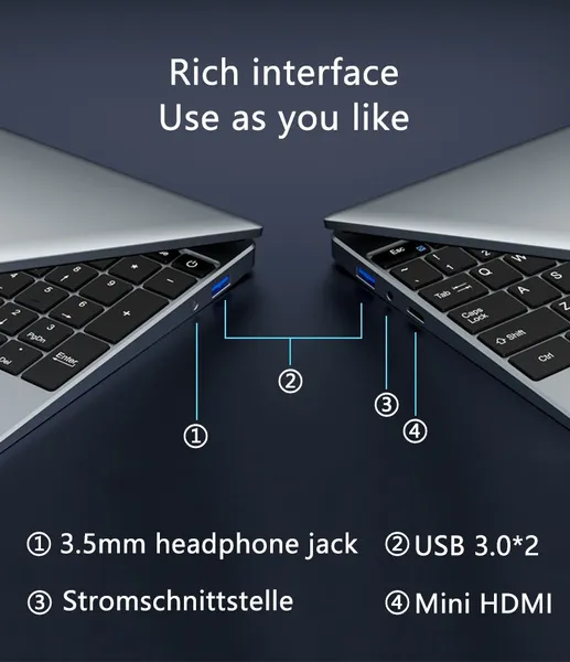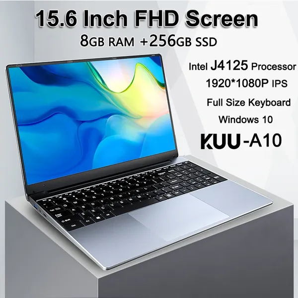 Welcome to our store! Note: All laptops have the English version of Windows 10 Pro installed. Buyers can easily set the local preferred language. KUU A10 Feature: 15.6-inch large screen / Intel Celeron J4125 / LPDDR4 8GB RAM / 3200Mbps Fast Transfer / Quad core / Efficient cooling system Better Performance, Less Expense, Make Your Business Life Easier Processor: CPU:Intel Celeron J4125 Processor Graphics:Intel HD Graphics 600 Number of CPU Cores and Threads: Quad Core; Quad Threads Processor Frequency:2.00GHz UP to 2.7Ghz Screen: Screen size: 15.6 inch (16: 9) Resolution: 1920 * 1080 FHD screen Storage: RAM: 8GB(DDR 4) ROM: 256G SSD (m.2 SSD) Dimensions: Product dimension (L x W x H): 359.87 * 237.94 * 18.65MM Package size (L x W x H): 48 * 30 * 9CM Net weight: 1560g Packing Weight: 2200g Network:Dual Band WiFi 2.4G / 5G, 802.11a / ac / b / g / n, IEEE 802.11ac Operating System: Windows 10 Camera:Front 0.3MP Speaker: Built-in two stereo speakers Fan: Single fan Material: plastic Battery:38Wh Keyboard Layout: QWERTY (Equipped with French, German, Spanish, Portuguese and Italian keyboard stickers) System Language: Chinese, English, Japanese, French, German, Korean, Italian, Portuguese, Russian, Spanish and other languages, You can change the languages in the setting. Connections extension: 2 * USB 3.0 1 * 3.5mm Headphone Jack 1 * Mini HDMI 1 * Power interface Package List: 1 * laptop 1 * Power Adapter 1 * Plug Adapter(depending on your shipping country)