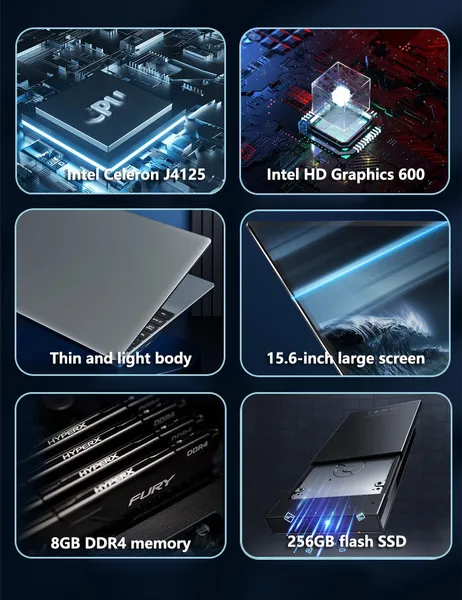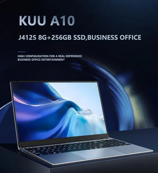 Welcome to our store! Note: All laptops have the English version of Windows 10 Pro installed. Buyers can easily set the local preferred language. KUU A10 Feature: 15.6-inch large screen / Intel Celeron J4125 / LPDDR4 8GB RAM / 3200Mbps Fast Transfer / Quad core / Efficient cooling system Better Performance, Less Expense, Make Your Business Life Easier Processor: CPU:Intel Celeron J4125 Processor Graphics:Intel HD Graphics 600 Number of CPU Cores and Threads: Quad Core; Quad Threads Processor Frequency:2.00GHz UP to 2.7Ghz Screen: Screen size: 15.6 inch (16: 9) Resolution: 1920 * 1080 FHD screen Storage: RAM: 8GB(DDR 4) ROM: 256G SSD (m.2 SSD) Dimensions: Product dimension (L x W x H): 359.87 * 237.94 * 18.65MM Package size (L x W x H): 48 * 30 * 9CM Net weight: 1560g Packing Weight: 2200g Network:Dual Band WiFi 2.4G / 5G, 802.11a / ac / b / g / n, IEEE 802.11ac Operating System: Windows 10 Camera:Front 0.3MP Speaker: Built-in two stereo speakers Fan: Single fan Material: plastic Battery:38Wh Keyboard Layout: QWERTY (Equipped with French, German, Spanish, Portuguese and Italian keyboard stickers) System Language: Chinese, English, Japanese, French, German, Korean, Italian, Portuguese, Russian, Spanish and other languages, You can change the languages ​​in the setting. Connections extension: 2 * USB 3.0 1 * 3.5mm Headphone Jack 1 * Mini HDMI 1 * Power interface Package List: 1 * laptop 1 * Power Adapter 1 * Plug Adapter(depending on your shipping country)