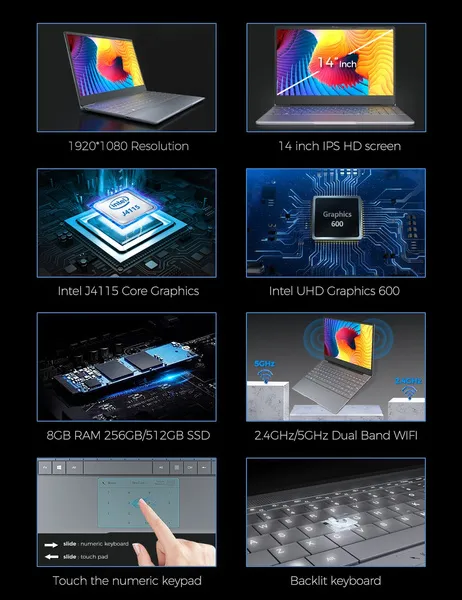 If you are not satisfied with our products, you can contact us at any time for a refund, without worrying about after-sales. It is our honor to be able to serve you.Welcome to our store! Dear Friends, KUU-K2s is an upgraded version of the K2 computer,The shell of this computer looks more high-end,making you more comfortable when using. Note:We will provide the corresponding power adapter and keyboard language sticker according to your purchase address. About KUU-K2s: The latest KUU-K2s is equipped with a 14.1 inch 1920*1080P IPS screen, delivers the vivid vision and wider visual experience. Power by Intel Celeron J4115 Quad Cores Processor ensure high performance, faster than Gemini-Lake N4100.8GB RAM, can run more games or software at the same time. Main Features: CPU: Intel Celeron J4115 Quad Cores(3M Cache,2.50 GHz) Ensure high performance,and faster response speed.A powerful CPU can ensure that you can run almost all the common vedio and software smoothly. GPU:Intel HD Graphics 600 This GPU can bring better game experience and more wonderful viewing effect so that you won't be forced to reduce the image quality when enjoying large-scale games. 14.1inch 1920*1080 IPS Screen Delivers vivid vision and wider visual experience. Operating System: Windows 10 Easily compatible with more software programs, more secure operating system, more suitable for office use. Multi Function Touchpad: K2's touchpad integrates the functions of digital keys. You can switch the number keys and touch pad at any time by sliding left and right, which is an innovative design to meet more needs of customers. RAM+ROM:8GB DDR4 + 512GB SSD Ensure that the response speed of the system is not affected while running multiple tasks, and bring you a smoother office and entertainment experience.Due to limitations in CPU processing power, and memory used by the operating system and pre-installed applications, the actual space available to users will be less than the nominal memory capacity. Actual memory space will change along with application updates, user operations, and other related factors. Fingerprint Unlocking: The power on key is equipped with fingerprint unlocking function. After setting, only the owner can unlock the laptop. Perfect protection of customer privacy. Removable Keyboard: The keyboard can be removed for easy cleaning and replacement. Backlit Keyboard: You can use this K2s laptop smoothly even in dark environment. All Metal Body: Simple and fashionable appearance, computer body made of magnesium aluminum alloy, more firm and durable. Privacy Camera: Closed camera design, with cover plate, to ensure that the user's personal information is more secure and not leaked. Full-size Keyboard: Full size keyboard, covering the whole notebook C surface, easy to operate and reduce the possibility of accidental touch; large size touchpad is more convenient to use. High Performance Battery: 38WH lithium batteries,with standby time of approximately 12 hours and use time of approximately 5 hours. Actual capacity may vary slightly.This capacity is the nominal battery capacity. PACKAGE LIST: 1 * Laptop 1 * Power Adapter 1 * Plug Adapter(depending on your shipping country)