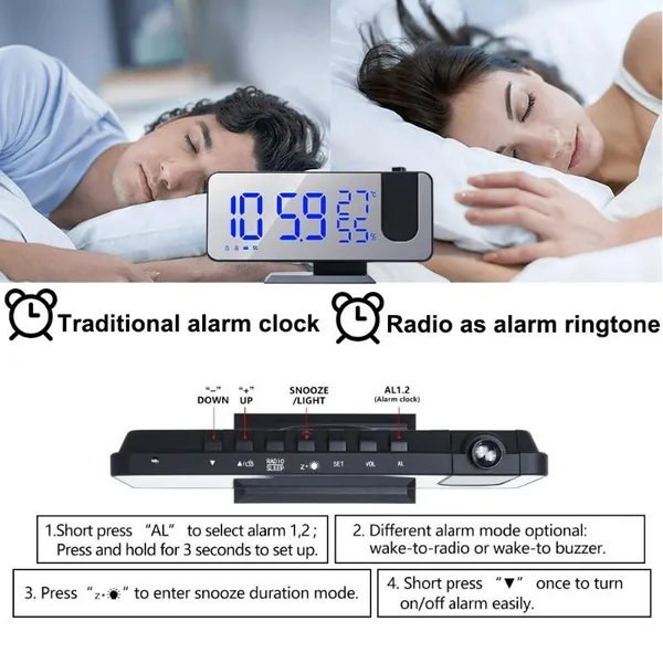 Dual alarm clock function: 2 alarm clocks can be set to any time separately, also set snooze mode.