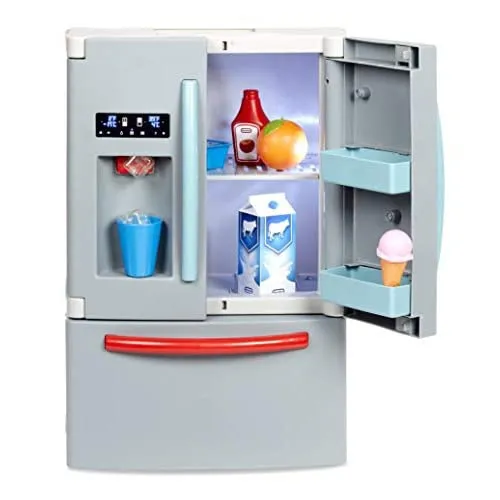 INTERACTIVE TOY: This toy refrigerator is designed so kids can pretend they're cooking and prepping meals as if they're using the real thing for hours of pretend play fun. SPECIAL FEATURES : The working ‘ice’ dispenser drops plastic ice cubes (included) and makes crushed ice and water dispensing sounds. The dual French doors feature an interior light that turns on and off when opened and closed. Separate pull out freezer beeps when it has been open too long. PRODUCT INCLUDES : 11 kitchen accessories: an ice cube tray, 4 ice cubes, 2 clips, an ice cream cone, a milk carton, a bottle of ketchup, and an orange. FREE TO DECORATE: Kids can decorate the fridge doors and make it their own using the clips to post grocery lists or display photos and art. GREAT FOR SMALL SPACES: Easy to set up to its full size (15.8” wide x 11.5” deep x 23” tall)