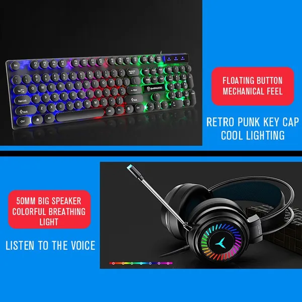 Gaming Keyboard, Gaming Mouse, Gaming Headset, Mouse Pad: Gaming set includes 104 Keys RGB Rainbow gaming keyboard, 4 color LED backlit gaming mouse, Large mouse pad, High sound quality and strong noise isolation gaming headset with microphone.
