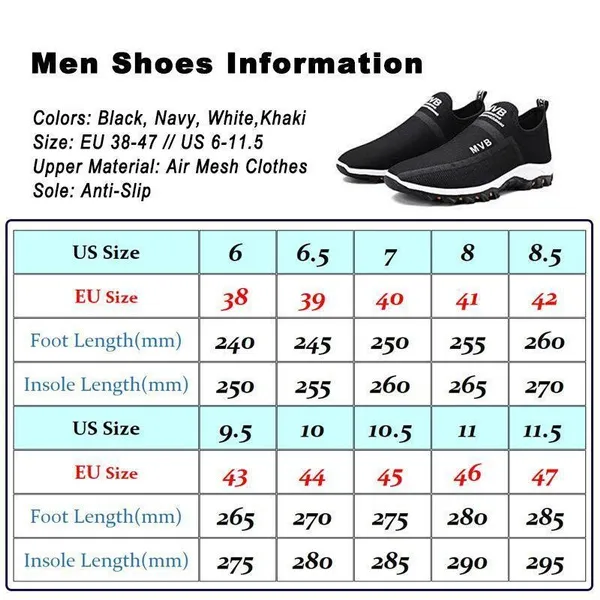 2021 New Men Casual Knitted Breathable Sneakers Outdoor Anti-Slip Travel Camping Hiking Shoes Light Weight Flat Sport Shoes Air Mesh Breathable Sock Shoes Indoor Outdoors Comfortable Soft Sole Running Shoes Athletic Tennis Shoes The shoes are ultra-lightweight, providing comfortable wearing The knitted socks shoes, this material is very flexible and can fit your feet perfectly, fully around elastic enclosed fit to your foot. With an anti-slip soft sole, give your comfortable whole days. Mesh breathable suitable for summer, when you doing exercise, traveling with family or camping hiking outdoors. Your foot also needs a dry and breathable space. And there is a little design, one loop at the back,it could help you easy to put on. The rubber sole would be wear-resistant, and you could wear it daily life. Gender: Men, Boys, Male. Function: Wear-resistant, Comfortable Soft Sole, Round Toe, Slip-On, Anti-Slip, Lightweight, Air mesh, Breathable, Socks shoes. Style: Leisure, Outdoors Occasion: Daily Life, Indoor&Outddor, Gym, Doing Exercise, Running, and so on. Upper Material: Flexible air mesh breathable clothes Toe shape: Round Toe Closure Type: Slip-On Colors: Black, Navy, White, Khaki EU Size: 38-48 / US Size 6-12 Note: 1. The Real Object May Exist Slightly Colors Differences Compared To Images As Different Device Display Caution If Minding, Thanks. 2. Then use this shoe size chart to convert the length of your feet to a U.S. shoe size. 3. If your foot breadth is wider than normal, please choose 1 size largerManufacturer:XlAMEN YINFEIDIE Network Technology Co., Ltd. Manufacturer Address: Room 810-18, No. 492, Xinglinwan Road, Jimei District, Xiamen,CN E-mail: xiamenyinfeidie@163.com This merchant is committed to offering only products that comply with the General Product Safety Regulation
