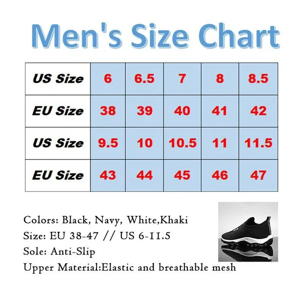 New Men Casual Knitted Breathable Sneakers Outdoor Anti-Slip Travel Camping Hiking Shoes Light Weight Flat Sport Shoes Air Mesh Breathable Sock Shoes Indoor Outdoors Comfortable Soft Sole Running Shoes Athletic Tennis Shoes The shoes are lightweight, providing comfortable wearing. The knitted socks shoes, this material is very flexible and can fit your feet perfectly, fully around elastic enclosed fit to your foot. With an anti-slip soft sole, give your comfortable whole days. Mesh breathable suitable for summer, when you doing exercise, traveling with family or camping hiking outdoors. Your foot also needs a dry and breathable space. And there is a little design, one loop at the back,it could help you easy to put on. The rubber sole would be wear-resistant, and you could wear it daily life. Gender: Men, Boys, Male. Function: Wear-resistant, Comfortable Soft Sole, Round Toe, Slip-On, Anti-Slip, Lightweight, Air mesh, Breathable, Socks shoes. Style: Leisure, Outdoors Occasion: Daily Life, Indoor&Outdoor, Gym, Doing Exercise, Running, and so on. Upper Material:Elastic and breathable mesh Toe shape: Round Toe Closure Type: Slip-On Colors: Black, Navy, White, Khaki EU Size: 38-47 / US Size 6-11.5 Note: 1. The Real Object May Exist Slightly Colors Differences Compared To Images As Different Device Display Caution If Minding, Thanks. 2. Then use this shoe size chart to convert the length of your feet to a U.S. shoe size. 3. If your foot breadth is wider than normal, please choose 1 size larger.Manufacturer:XlAMEN YINFEIDIE Network Technology Co., Ltd. Manufacturer Address: Room 810-18, No. 492, Xinglinwan Road, Jimei District, Xiamen,CN E-mail: xiamenyinfeidie@163.com This merchant is committed to offering only products that comply with the General Product Safety Regulation