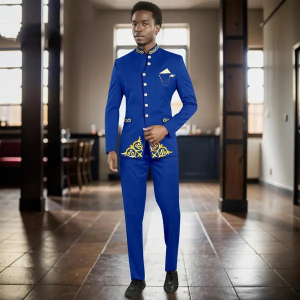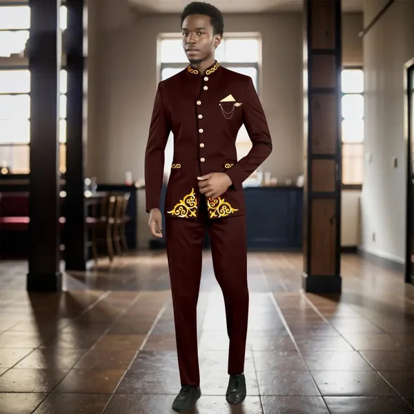 Men`s Suit Single Breasted Embroidery Brooch Blazer and Trousers 2 Piece Set Formal Outfits African Clothes for Wedding 2416112