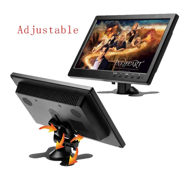 Specification: Maximum resolution supported:1024 X 600 Brightness: 400 cd / square meter Contrast: 500: 1 Aspect ratio: 16: 9 Response time: 5ms Viewing angle: 85/85 (left / right), 85/85 (up / down) Video signal input range: 0.7 to 1.4Vp-p / 75 Ohm Input frequency supported: H: 30 to 60 kHz, V: 60 to 75 Hz Speaker output power: up to 1 W / 8 ohms Video color system: PAL-4.43; NTSC-3.58 HDMI support format: 480i (60Hz), 480p (60Hz), 576i (50Hz), 576p (50Hz), 720p (50 / 60Hz) NTSC / PAL video color system, brightness, contrast, color, and hue adjustments Supply voltage: DC7.9V to 13.5V Power consumption: up to 8W Standby current: up to 35 mA Operating temperature: -20 to 50 degrees Celsius Storage temperature: -30 to 65 degrees Celsius Ports: VGA, BNC, USB, HDMI, AV input, DC 12V Languages: French, English, Italian, Spanish, German, Chinese, Turkish, Russian Package included: 1 x 10.1 inch LCD Monitor 1 x Power Adapter (there are four plug(AU/EU/US/UK), please choose which one you need.) 1 x HDMI cable 1 x VGA cable 1 x AV Cable 1 x BNC Cable 1 x Mount Bracket 1 x Remote Control 1 x Two-sided adhesive Notice: If you use this for video games, this AC adapter does not allow working too much long time. Do not turn off the power in an emergency, but turn off the monitor firstly. This product has 4 kinds of input mode (HDMI, VGA, AV1, AV2), or a cable connection, press the AV1 / AV2 button, Switching input mode and a corresponding mode. To protect the screen, it is best not to peel off the protective film. Because there is no influence on the use of the product. Easy to mount and pack: The stand is perfect allowing you to adjust the viewing angle and rotate the screen to meet all your needs. Portable to carry so that you can enjoy your favorite shows at home, on car or during travel. There are four holes on the back of the monitor, so that you can hang it on the wall as a TV. (screws not included).