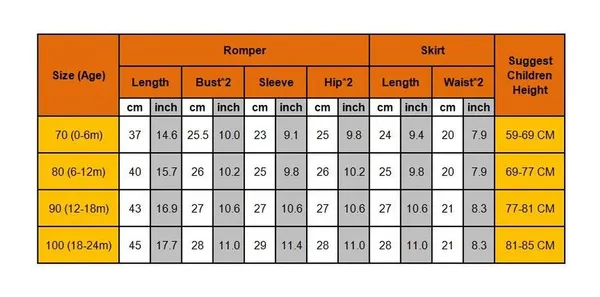 100% Brand New&Good Quality Material: Cotton/Polyester Color: As Picture Size: 70 80 90 100 suits for 0-24 Months. Please check our detailed size chart, 1 CM=0.39 INCH. Attention: - Manual size measurements, please allow 1-3 CM differs. - Color may be little different due to monitor, thank you. Package included: 1 x Baby Girls 2PCS Suit(Romper+Skirt)