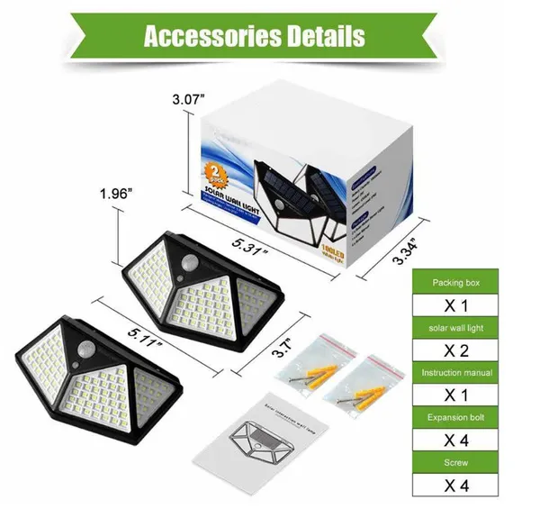 Features: Well quality: Use by well quality ABS material, it is durable to use outdoor and long term use. PIR motion sensor: The sensitive PIR sensor light can detect people movement from 3 to 5m. It will automatically control the light on and off. IP65 water resistant: The Solar Light is made of ABS and IP65 Water-resistant material. It can work in different kinds of weathers like rain snow ang fog. Long working hours: If fully recharges the battery more than 8 hours with direct sunshine, it will keep lighting more than 8 hours Powered by solar energy: The solar panel is at the top of the lamp. It will automatically store electricity during the day. Please install the product at the direct sunshine place. This Outdoor Solar Light is wireless. You can install it on the wall Super bright: Much brighter than other lamps. Each solar-powered path light has superb-bright eye-protective, flicker-free and no-radiation white LED lights for illumination. It is easy to install on the tree glass metal. Product Details: Input Voltage: 5.5V Total power: 20W Bulb type: LED Light source: Solar Light LED quantity: 100pcs LED Light color: White Power source: 1* 3.7V 2200mAH lithium battery Charging hours: 8hrs Working hours: more than 8hrs Control modes: Light/ PIR High light delay: 20-25s Sensor angle:120° Sensor distance:3-5m Protecting grade: IP65 Material: ABS Item color: Black Package Contents: 1 * Outdoor LED Solar Light 1 * Expansion Pipe 1 * Screws 1 * User Manual Note: Please make sure the solar light been installed within 3 meters height and make sure the solar panel can absorb sunlight. Before use please turn on the switch.