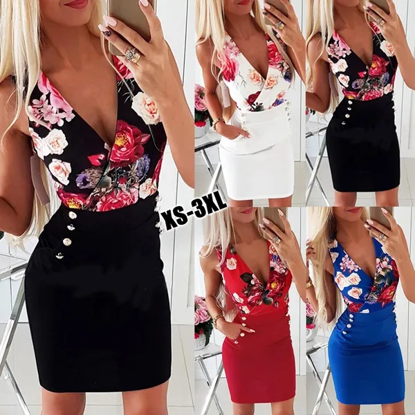 New Summer Women’s Fashion Casual Slim Dress Deep V-neck Floral Print Dress Sleeveless Pocket Dress