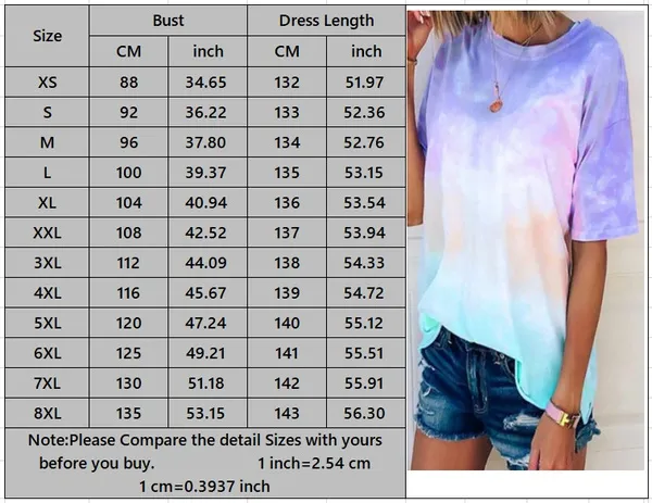 Welcome to our Store! Conditions: Brand new and high quality. Gender:Women Style: Casual Pattern: Gradient color Type: T-shirts Type Version: Loose Sleeve length: Short sleeve Neck: O-Neck Size:XS-8XL Color: See the description of the picture Please order by Size Chart on the picture to make it fit! ( Please allow 1-3cm differs due to manual measurement, thanks ) Package Contents: 1 x shirt You can purchase other products you need in our store by clicking on Visit Store Thank you very much! Name of Responsible Person: VAT SPEED SL Address: Calle Antonio Salvador N99.1 eMail:services@vatspeed-eu.com This merchant is committed to only offering products that comply with the General Product Safety Regulation.