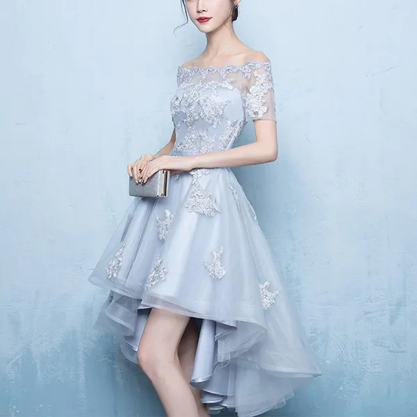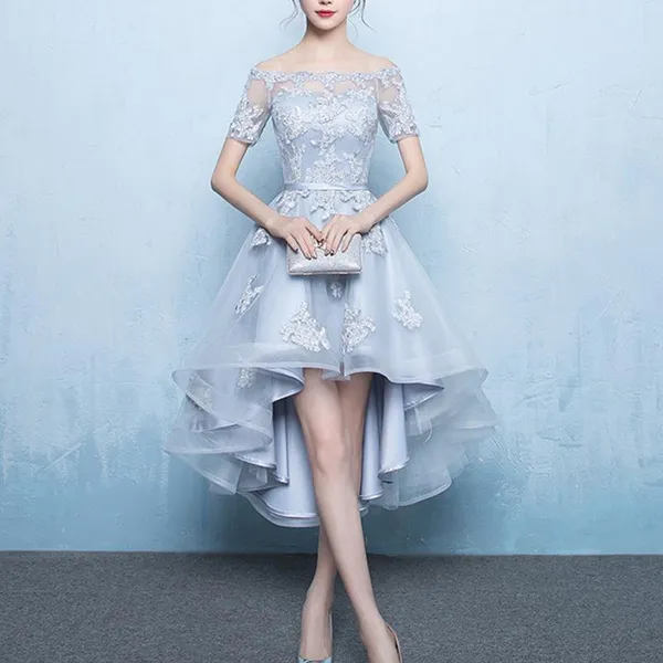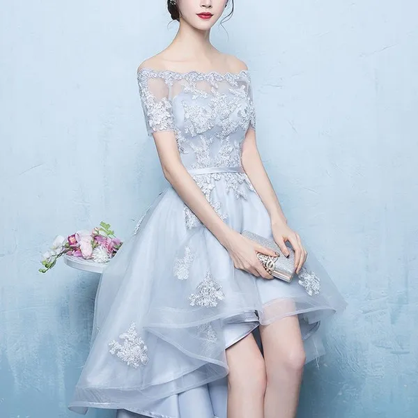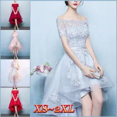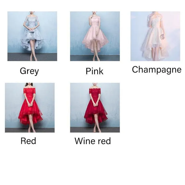 Dresses Length : Knee-Length Neckline : Boat Neck Sleeve Length(cm) : SHORT Decoration : Embroidery Decoration : Lace Age Group : Adult Item Type : Bridesmaid Dresses Sleeve Style : Regular Fabric Type : Organza Built-in Bra : Yes Fashion Element : Backless Waistline : Natural