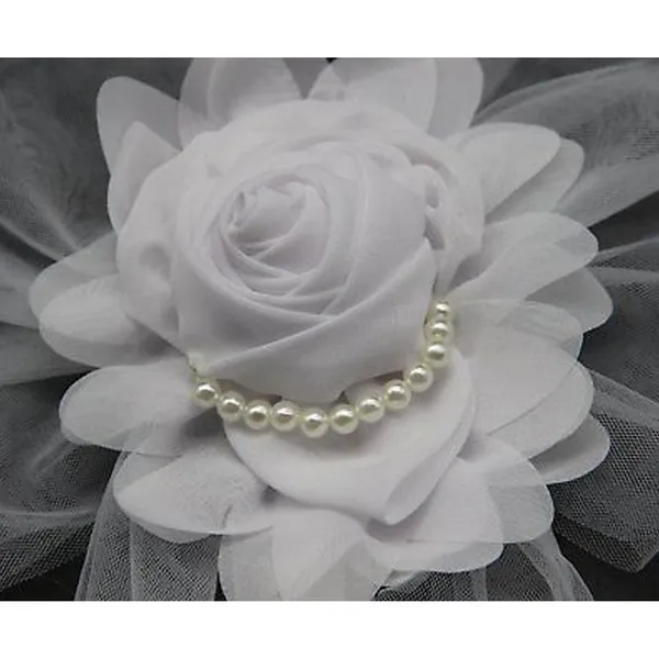 Material: polyester silk,pearl, yarn ribbon Total length:15.6 inches;Width:8.6 inches Perfect for wedding decoration. Package: 1pc