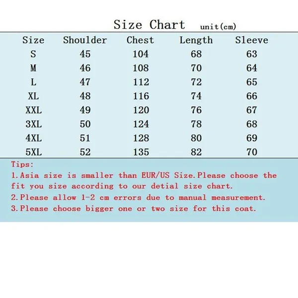 Description Materials: Polyester,90%white duck down Color: Black, Navy blue,Green, Wine red,Gray,Orange Asian Size: S-5XL Size information:(Please according to size table to choose suitable for you coat.) Notice: 1.Asia size is smaller than US/UK size .Please check our size table to select a suitable size(just for reference). 2.If your measurements happen to be between two sizes,please choose the next bigger one. 3. Please allow 1-3CM differences due to manual measurement. 4. Due to the light and screen ,the color may be different .Please allow reasonable color difference. Shipping Time: Delivery time is about 7-14 days to Europe and America Most areas. few areas need more time, such as: South America,etc.