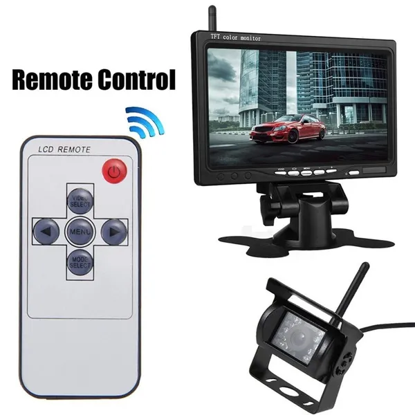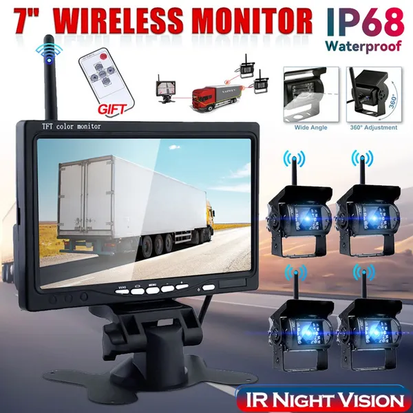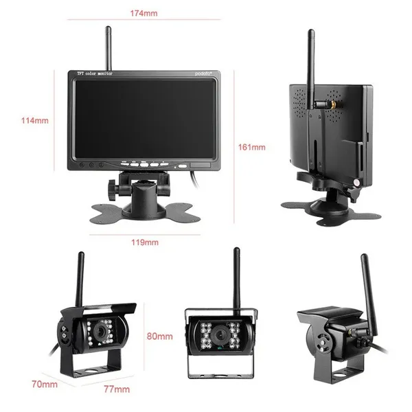? Welcome to my store----PODOFO ! Have a good shopping time ! ? Loving life, loving shopping. ? NOTE: 2CH OR 4CH Wireless Backup Cameras is OPTIONAL ? NOTE: Please read the details page in detail to make sure your car model matches this machine ? Package Include: 1 x 7 inch Wireless Monitor 2 x Wireless Backup Cameras(OPTIONAL) 4 x Wireless Backup Cameras(OPTIONAL) 1 x Remote Controller ? Product Features: 1. 7-Inch TFT LCD widescreen wireless monitor--With high resolution image, full color display and low power consumption. 2. Two Wireless Ir Night Vision Waterproof Rearview Back Up Reverse Cameras --Auto Water-resistent Camera Lens, with 18 individual Infrared (IR) LED. Effective range up to 15m. 3. 4 Cameras 2 Video Inputs--A camera mounted on the front of the car and the second in the back of the car. You can press the switch button to view the back and front of cars 4. Easy to install--Wireless parking assistance; The monitor will start up automatically, and synchronously display the video from rearview camera when you're backing or braking your car. 5. IP68 waterproof grade can cope with marine environment. Hard Metal Cased Camera; Waterproof and Mud proof; It can last for longer without heating up, so you can show the rearview all time. ? Specification: 2.4GHz analog wireless 7-inch monitor Operating Frequency: 2400-2483.5 Transmission distance: 30 meters Compression format: MPEG 4 video OR 2 video Transmit frequency:18 dBm Transmission speed:12 Mbps FHSS: Frequency Hopping Spread Spectrum Hopping rate:1200 / S Screen size: 7-inch 16:9 Resolution: 800RGB x480 dots TV System: PAL / NTSC Operating voltage: 12V / 24V DC Power: ≤8.64W Operating temperature: -10 ℃ to + 65 ℃ Language:English/French/Spanish/German/Italian/Portuguese/Dutch/Russian/Chinese/Japanese 2.4GHz analog wireless camera Standard NTSC: 510 * 492 pixels, PAL: 510 * 582 pixels Frequency: 2370, 2510, 2390, 2490 Resolution: 420 TVL Lens: 2.5mm Minimum illumination: 0Lux (LED ON) Infrared light: 18pcs Night vision distance:15 meters Waterproof: IP68/IP66 View angle:120 ° Operating voltage: 12 / 24V DC Operating temperature: -20 ° C ~ + 70 ° C Shell material: Aluminum Mount material: Metal
