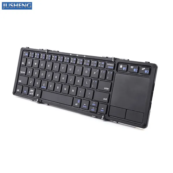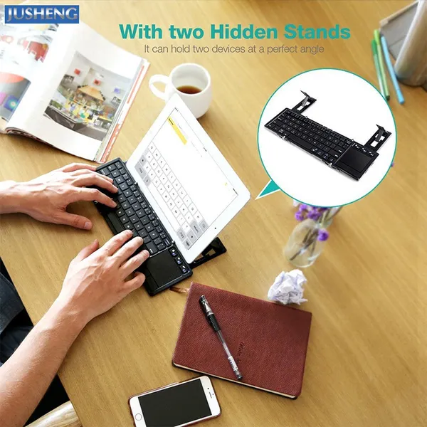 1.Sensitive Touchpad: free your hand but without a mouse to operate, up to 6 touch gesture for Android and Windows system; Note: iOS system is not compatible with touchpad function. 2.Triple Bluetooth Channel: up to 3 pairing channel, maximally connecting 3 devices but one device permit one channel at once. 3 channel for different device and switch easily. 3.Specific Support Design: Tri-folds keyboard and portable support, magnetism design, with two feet stands on both keyboard sides to keep balance and stable while typing. 4.Long Uninterrupted Work: with built-in rechargeable lithium battery, just need 2 hours charge time but working for up to 80 hours. And durable ergonomic design, suitable keycap, providing a slim pocket size and smooth comfortable typing experience. Support : for iOS/androids/windows system Touchpad: compatible with andriod/windows Material: aluminum Features: 1.foldable keyboard with touchpad 2. connect 3device at the same time 3. with two hideable stands Color: Black Packing: charging cable, manuel, color box. Weight: G.W 0.345kg/ N.W 0.23kg touchpad size: 55.2*45.8mm Folded size: 158.68*90.56*18.16mm open full size: 278*90.56*5.65mm Multifuntion Bluetooth Keyboard EC Technology tri-folding bluetooth keyboard, add more functionality to satisfy everyone's need. Longer battery life, wide compatibility, touchpad, triple bluetooth channels, tri-folds and mini packed size, they all specifically designed for easy and portable daily use. Touchpad Function: 6 touch gestures perfectly work with Android and Windows system, if you have a habit of touch control and mouse free, it is your best choice. Note: not compatible with iOS system Switch Easily Between Devices Compatible for triple Bluetooth channels, with 3 Bluetooth devices memory, easy to switch between them. The latest Bluetooth technology allow you move seamlessly between 3 connected Bluetooth-enabled devices, only need one single step and easy-switch from Mac to iPad or iPhone. If you have habit of operating several devices at the say time, then it is designed for you. Tri-folds and pocket size: Triple folds with magnetism design, while extends with two feet stands, it can support most size devices of your phone or tablet; Mini pocket size, easy carry and fold up when you need a portable use of everywhere, café, restaurant, book store and office, etc Wide Compatibility of Keyboard Works well with bluetooth enabled devices of Android / Windows / IOS system. iPhone / iPad / Samsung Glaxy / Surface / Nexus / HTC, etc. Bluetooth reception range up to 10 meters. Type at Any Place You Like Type on your lap, kitchen table or at your favorite cafe without wires getting in the way. The keyboard pairs easily with your device over Bluetooth—so you’re free to place both in just the right position for comfortable typing. Package Included: 1 x EC Technology Bluetooth Keyboard; 1 x User Manual; 1 x USB Charging Cable;