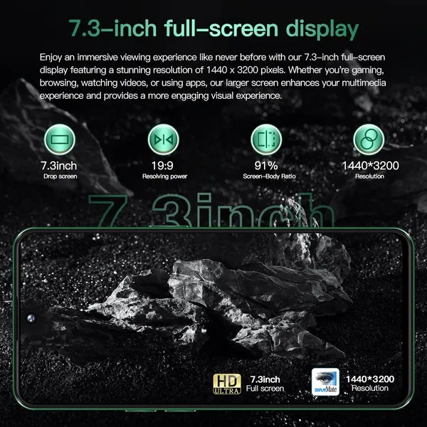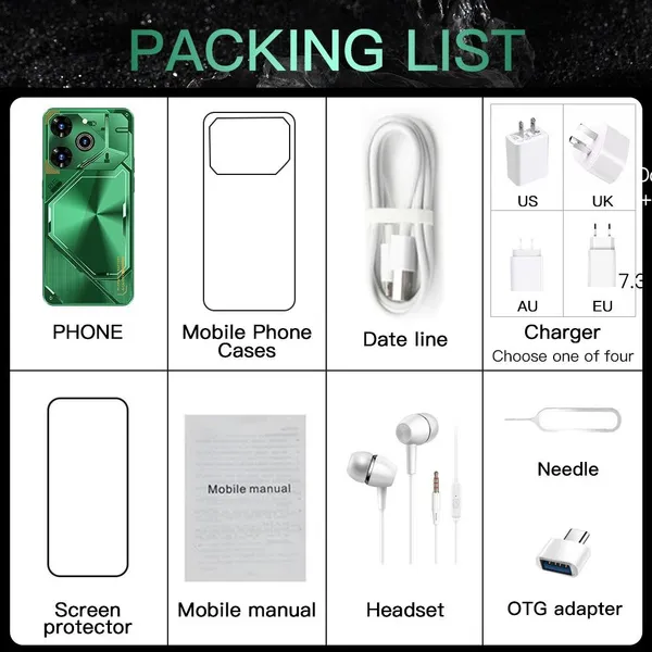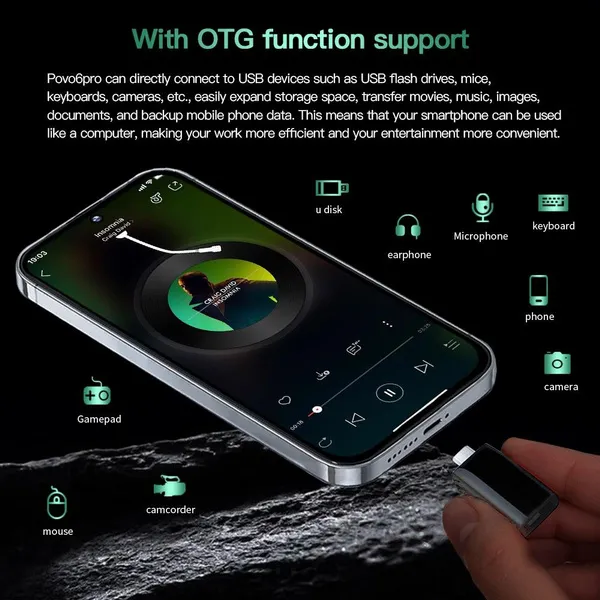 Factory direct sales, better quality but lower price is our target and mission! Feature: - 7.3inch FHD Display The Povo6pro delivers the viewing experience you always wanted, With a massive 93% screen-to-body ratio on a 7.3"inch screen. - 50MP Front Camera Clear and Stylish Selfie The Povo6pro world-leading 50MP front camera turns your every selfie into a work of art experience greater brightness, color vibrancy, clarity and dynamic range. Even in the dimmest light, whenever you need it, your Povo6pro is right there with you, capturing every moment with crystal-clear precision, Turn your selfies into masterpieces and shine in every photo. - 108MP Rear HD camera The Povo6pro features a 108MP camera combination. The main camera sports a large f/1.8 aperture and 1.28um pixels, This strong combination boosts photo-sensitivity in backlight or low light, Just point and shoot, and Povo6pro will make sure your pictures remain clear and bright. - Face Access The Povo6pro also supports facial recognition upon activation,Povo6pro scans your facial features and unlocks instantaneously accessing your phone has never been so easy, or so fun. - Powerful Performance The Snapdragon 8 gen3 mobile platform with 10mm process technology makes young people who love the young and other popular games. The game is on and lower. - Android 14.0 The new interactive design makes the operation simple and simple, the use of the mobile phone is so simple and straightforward, everything is handy. - Dual SIM card Dual card dual standby, card slot does not distinguish between the main and the deputy, supporting the worlds 50 major communication carrier networks Specification: 1.Model No.:Povo6pro 2.Platform : Snapdragon 8 gen3, Deca Core (Latest 10 Core) 3.Standby: Dual sim dual standby 4.Screen: 7.3HD+ Full Display 1440*3200 5.Speaker: 1511 Box Speaker 6.Frequency: GSM850/900/1800/1900MHz, 3G:WCDMA850/1700/1900/2100MHz *4G *5G 7.Vibration: Support 8.Colors:Comet Green, Meteorite Grey 9.Memory: 16GB RAM+1TB ROM 10.Multi Media: MP3/MP4/3GP/FM Radio/Bluetooth 11.Camera: 50MP+108MP 12.Multi Function: Full screen, Face recognition, Dual SIM,2.4G Wi-Fi, GPS,OTG,Gravity Sensor, Alarm ,Calendar ,Calculator ,Audio recorder ,Video recorder, WAP/MMS/GPRS, Image viewer,E-Book,World clock,Tasks card, rear flash 13.Languages: Muti-language support 14.Others: Android OS 14.0 System 15.Battery: 8000mAh Lithium-ion battery 16.Ultra unibody 17.TypeC input Package Included: 1 x Smartphone, 1 x Charger Adapter, 1 x Headphones, 1 x User Manual, 1 x phone case, 1 x Protection film 1x OTG input Attention: *The frequencies supported by the device may vary depending on the region. The mobile phone support GSM,WCDMA (For example USA operators:T-mobile,AT&T,Straight Talk,Cricket Wireless,Google Project Fi,Lycamobile,MetroPCS ,MintMobile), whether to support 4G, 5G depends on the local operator networksupport,does not support the Telecom CDMA network. (For example USA operators:Verizon,Sprint,U.S Cellular,Boost Mobile,FreedomPop,Ting) *In terms of memory and capacity, the actual available capacity will be reduced and different due to many factors: because the operating system occupies part of the memory (RAM), the actual available space is less than the marked memory capacity; due to the installation of the operating system and pre-installed programs occupy part of the flash memory (ROM), and the actual available storage space is less than the indicated flash memory capacity. *In terms of charging, data such as speed and duration are all our laboratory data, and the actual situation may vary slightly depending on the version of the test software and the specific test environment. In the end, the actual usage time shall prevail. *When the phone is completely out of power and automatically shuts down, you need to charge your phone for more than 10 minutes to boot. It is recommended to charge when the battery is less than 20% charged.