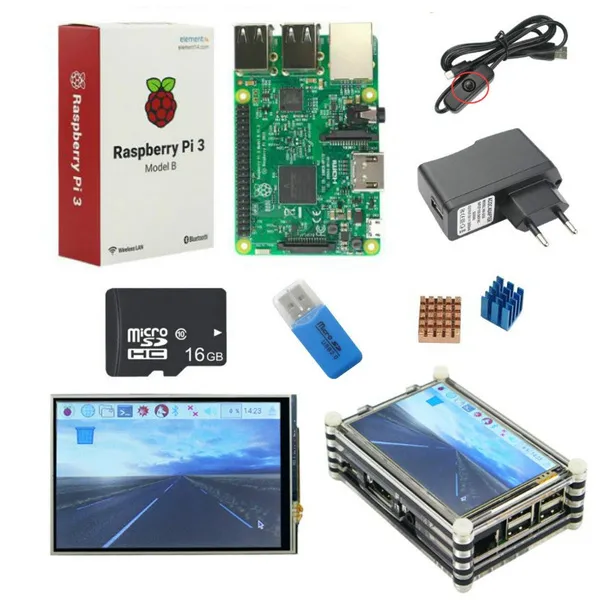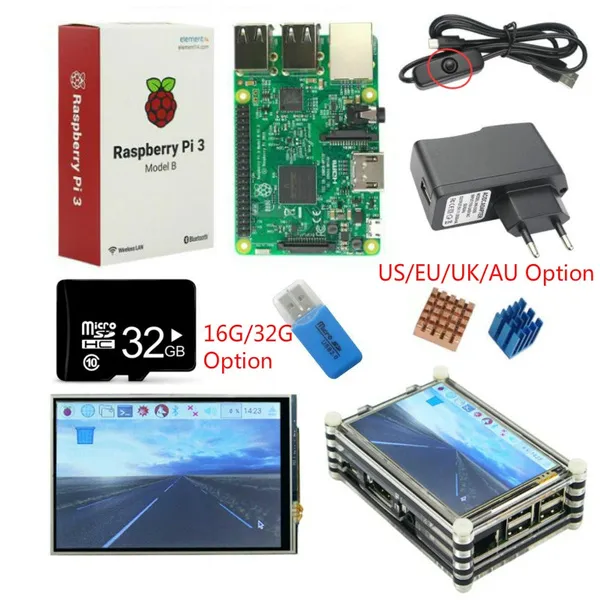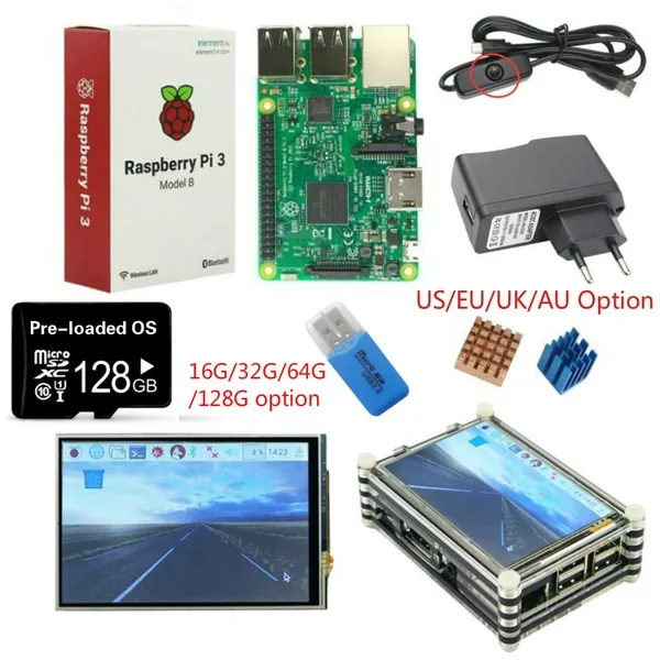Original Raspberry Pi 3 board + 3.5 inch Touchscreen + 9-layer Acrylic Case + 2.5A Power Plug with switch cable + Heat Sink (Pre-loaded image OS SD card option)