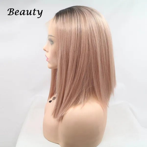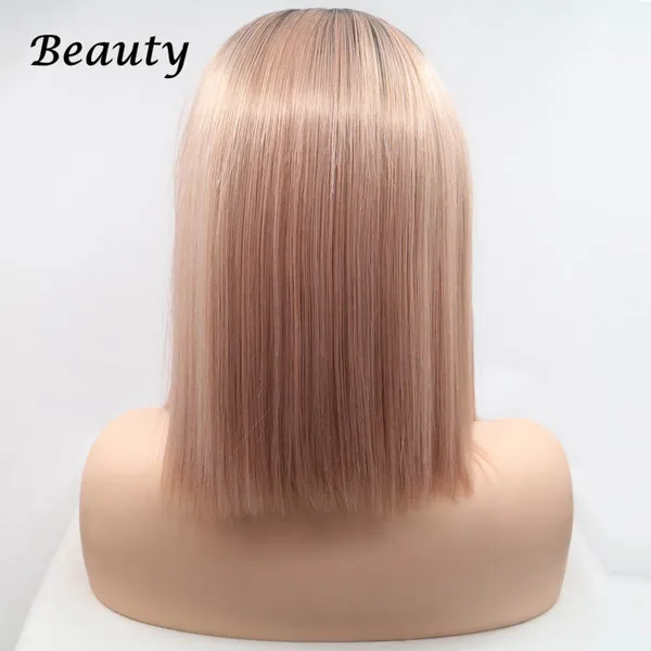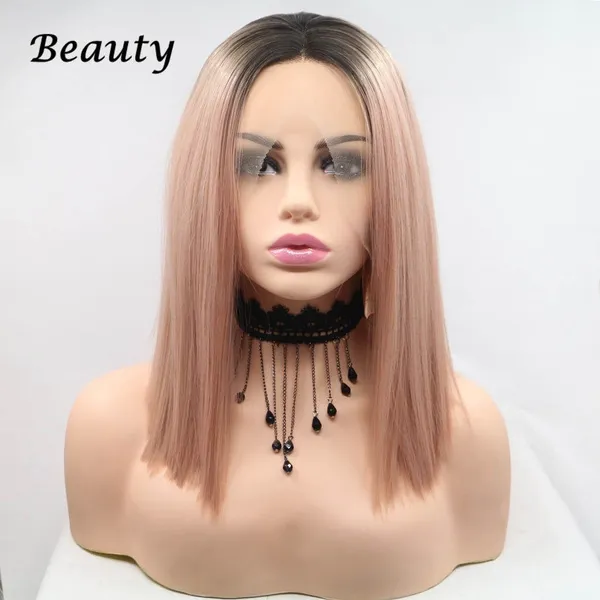 short bob hair pink Rose Gold Lace Front Lace Wigs Synthetic Straight Heat Resistant Fiber Wigs Middle Parting Wig