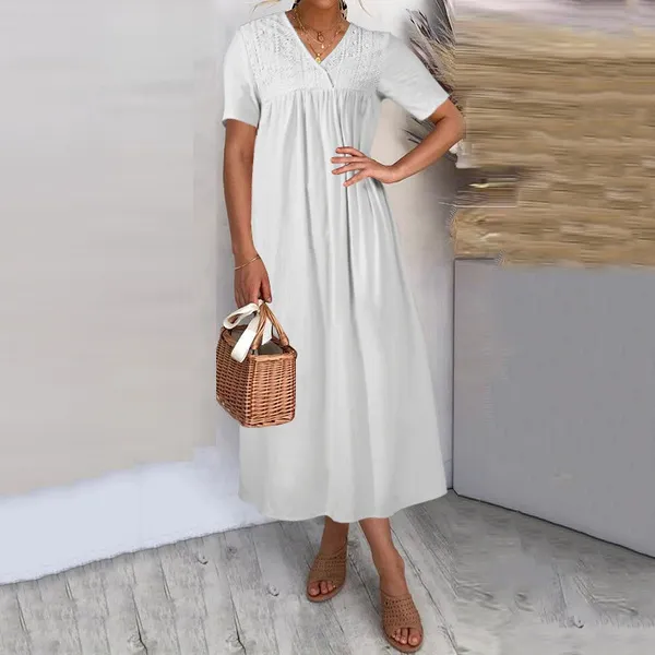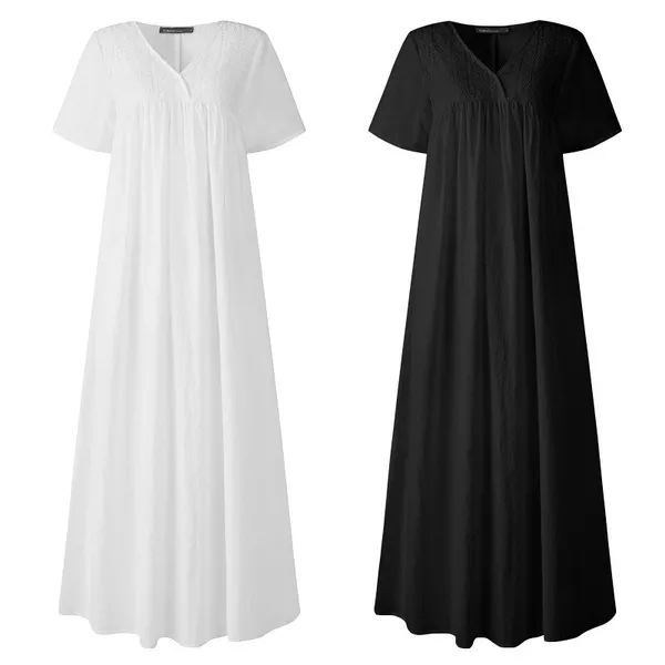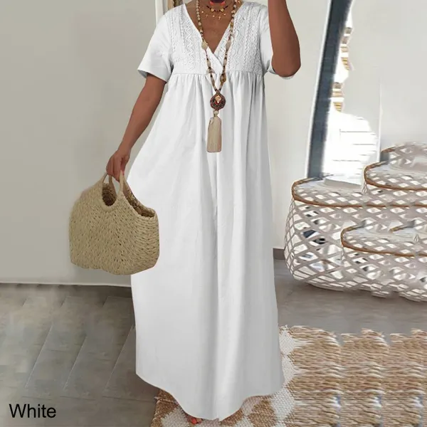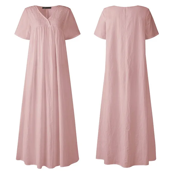 Package include: 1 Dress Material: 100% cotton Type:Dress Color: Pink,White,Black,Dark Grey,Khaki,Coffee,White Dot,White Floral,Floral Print,Pink Flowers Size: S/M/L/XL/2XL/3XL/4XL/5XL Season: Spring/Summer/Autumn Occasion: Casual/Holiday Product Detail: -Sleeve Length: Short sleeve -Neckline: V-Neck -Pattern: Lace stitching -Length: Long dress -Features: Short sleeved v-neck lace patchwork dresses designed by a niche crowd -Style: European and American style,Leisure vacation style Attentions: 1.The Real Object May Exist Slightly Colors Differences Compared To Images As Different Computers Display.Caution If Minding,Thanks. 2.There Might Be A Manual Measuring 1-3 cm Error.Sorry For Any Inconvenience. 3.Please Prevail On Real Item, Model Images For Reference Only. 4.Attention!!!Please check the size chart carefully before placing the order.