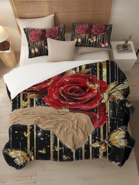 Three-piece fluffy printed double bed set, soft, comfortable and breathable bedding set, suitable for all seasons (without sheets, without fillers)