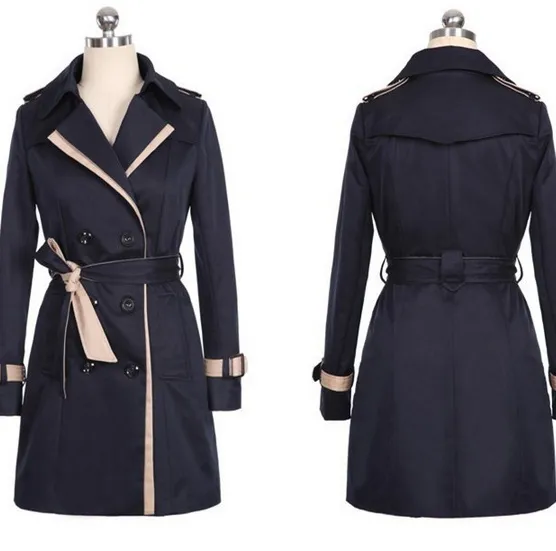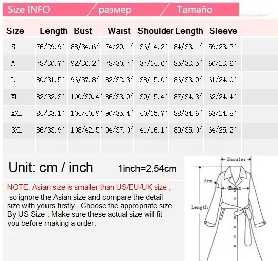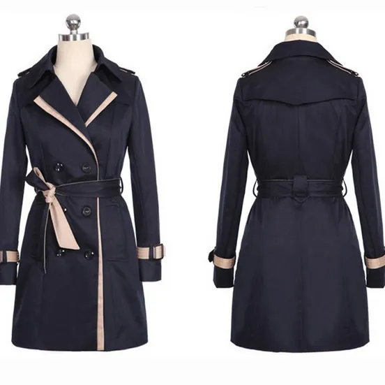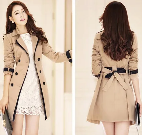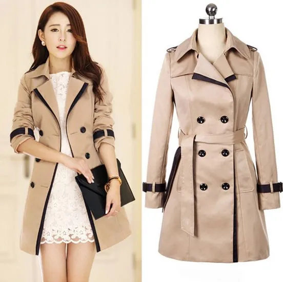 Description Outerwear Type: Trench Gender: Women Clothing Length: Long Closure Type: Double Breasted Fabric Type: Broadcloth Collar: Turn-down Collar Sleeve Length: Full Type: Slim Style: Fashion Material: Spandex,Acrylic Sizing Chart