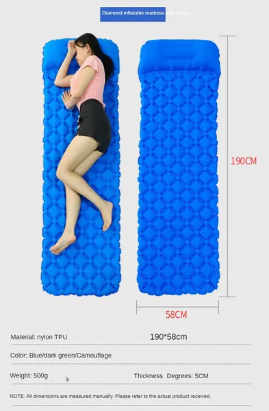 Production Description name: Air Mattress Material: Nylon TPU Seal Coating weight: about 500g color: green, orange, blue Size Before Filling: 26 * 10 cm (long * wide) Size After Filling: 190 * 60 * 5 cm (long * wide * thick) Package List: 1 * Air Mattress 1 * Storage bag Product Showcase HitorHike Inflatable Sleeping Mat Dimensions (L x W x T): 1900 x 600 x 50 mm