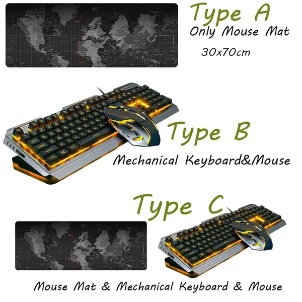 Type A Included: 1 x Mouse Pad 1. The mouse pad is mainly made of natural foamed rubber, with small and dense bubbles, which makes the mouse pad soft and elastic, thicker design, and more comfortable to operate. 2. The high-density weaving process creates a smooth surface and gives him a smooth feel close to the resin, effectively reducing the hand fatigue caused by long-term use of the mouse. 3. Using natural rubber bottom, safe and environmental protection, the bottom to strengthen the attachment lines, firmly adhere to the table without deformation. 4. The edge of the lock mouse pad is knitted with extra fine knitting method, which can remove excess continuation edge to ensure that the mouse pad is more durable. Specification: Use Environment: Office/Game/Desktop Material: Natural Environmental Rubber Patterns: World Map Colour: Black Size: 30x70x0.2cm/11.81x27.55x0.07'' Note: Please allow 1-3mm differs due to manual measurement. Due to the different display and different light, the picture may not show the actual color of the item. Thanks for your understanding. Type B Included: 1x Mechanical Keyboard 1 x Mouse Type C Included: 1 x Mechanical Keyboard 1 x Mouse 1 x Mouse Pad Feature: 1. The product configuration is the middle end game IC; the mouse key life 1000W times. 2. DPI four gear regulates 1000-1600-2000-4000. 3. The mouse button uses the high-grade skin like technology, the side uses the metal texture electroplating craft, the mouse bottom adds a piece of 1.0 thickness steel plate,full of metal feeling. 4. Seven color breathing light is uniform and comfortable. 5. The keyboard adopts the mechanical hand feel liquid silicone, the key cap is double colored injection molding, the light transmittance is good. 6. The upper cover of the keyboard is made of aluminum alloy wire drawing technology, which is much higher than the iron sheet on the current market. 7. The brightness of the lamp can be adjusted. Specification: Keyboard: Wire: 1800mm/5.9ft plastic wire Key cap: double color injection molding Panel: aluminum alloy wire drawing Pressure: 50±5 Mouse: Wire: 1800mm/5.9ft plastic wire DPI: four gear adjustment (1000-4000) Material: sanding like skin Pressure: 65±10 Color: Tungsten Gold, White, Black