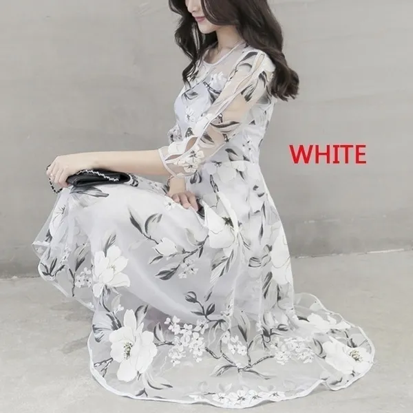 Women Fashion O-neck Lace Double Layer Flower Prom Party Beach Dress White Casual Dresses S-3XL