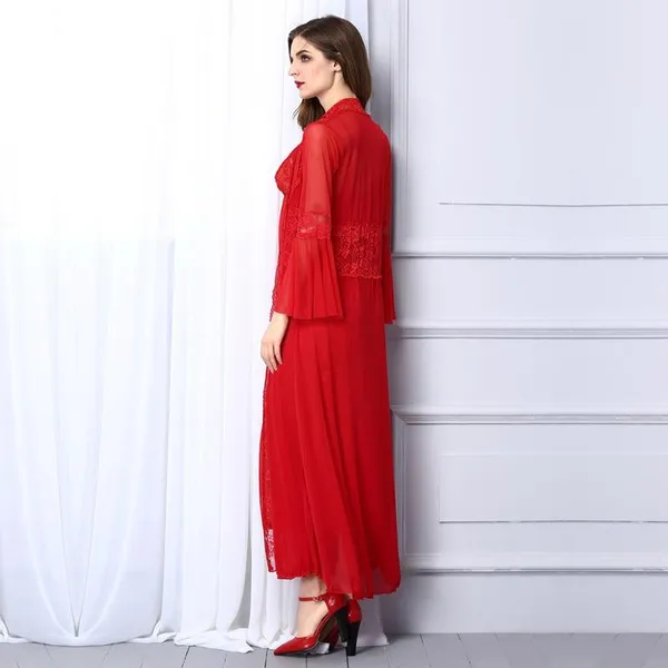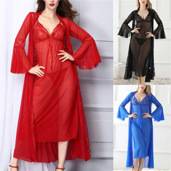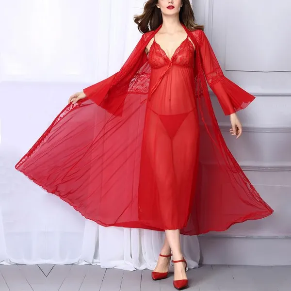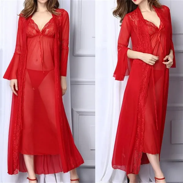 Features: 1.It is made of high quality materials,Put your body in a totally relaxed status 2.Focuses on a perfect underwear for you,Make you super sexy and seductive 3.Serve as a nightwear and also a stimulative sex kit for sexual life of couples 4.The lace design is very perfect,sexy and elegant,I am sure you will like it! 5. Flared sleeve long robe design, Make you super Noble, elegant and beautiful! Product information: Occasion:sleepwear Material:Polyester,Lace Popular elements: lace, flared sleeves, long robe How to wash:Hand wash What you get:1*Long Robe,1*G-string,1*Cami
