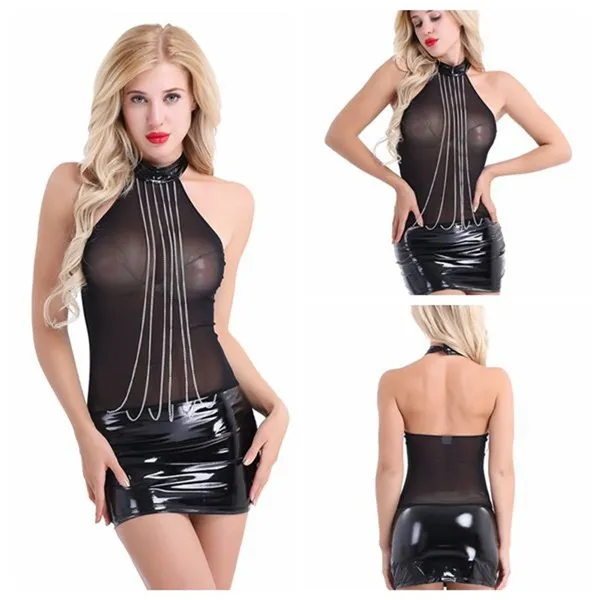 Set Include: 1x Dress Condition: New with tag Material: Patent Leather+Mesh+Metal Color: Black(as pictures show) Dress Length: Mini Features: Women's wetLook party club dress nightwear, backless and pull on closure. Sleeveless and halter neck, patent leather and see through mesh splice design. Six shimmering silver chains run from the neckpiece to the top of the skirt, draping down and highlighting. Soft material offers a comfortable fitted feel, perfect for clubwear, party, stage performance, etc. Please refer to the size measurement below before ordering. Hand wash recommend, do not ironing. Size: S-XL (PLEASE do check the actual measurement to pick right size.) Size Chart:The suggested age and height is just for your reference. If your measurement is floating between two sizes, advise choosing the larger size. (Measurements shown in the size chart refer to item measurements, not body.) Friendly Tips: The size is measured by hands, please allow minor error of measurement. Photo color might be a little different from the actual product due to color display of different monitors.