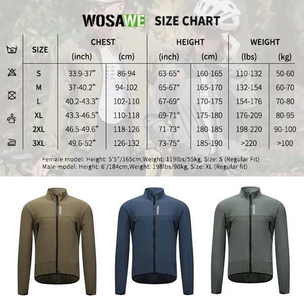 Men Women Cycling Wind Coat Color: Green, Blue, Yellow Size: S, M, L, XL, 2XL, 3XL 1. 【Composite Fabric】 Nylon-Spandex Hybrid Tech Fabric, Windproof & Abrasion-Resistant, 30% Enhanced Tear Strength 2. 【Optimized Ventilation System】 Back Mesh Panels+ Underarm Vents + Pockets Lining Vents, 40% Improved Moisture-Wicking Efficiency 3. 【All-Weather Protection】 Hydrophobic Coating + Thermal-Lock Windproof Design, Ready for Sudden Weather Changes 4. 【Precision Thermo-Regulation】 Dual YKK® Zipper + SpeedDraw Cord, 1-Second On-the-Go Adjustment 5. 【Ergonomic Fit】 Elastic Cuffs & Hem, Anti-Chafe Seam Binding, Enhanced Ride Comfort & Durability 6. 【Night Visibility】 Reflective WOSAWE at chest + Dual-Silver Reflective Strips at back 7. 【Convenient Storage】 Dual-Sided High-Capacity Zippered Pockets, Secure & Quick Access 8. 【All-Season Versatility】 Unisex Cut, 3-Season Ready (5°C~25°C), Road/MTB/Urban Compatible