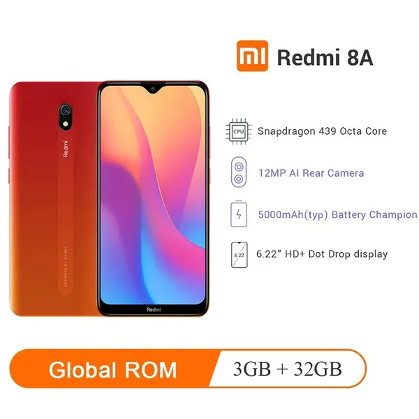 Brand Name : Xiaomi Battery Type : Not Detachable ROM : 32G/64G Item Condition : New Operation System : Android Biometrics Technology : NO Standby Time : Other Front Camera Quantity : 1 Rear Camera Pixel : 12MP Battery Capacity(mAh) : 5000 Fast Charging : Nonsupport Phone Type : Smart Phones Touch Screen Type : Capacitive Screen Language : English Language : Russian Language : German Language : French Language : Spanish Language : Polish Language : Portuguese Language : Italian Language : Korean Language : Japanese Optical Zoom : NO Display Resolution : 1520x720 Rear Camera Quantity : 1 Charging Interface Type : TYPE-C Front Camera Pixel : 8MP Wireless Charging : NO Design : BAR SIM Card Quantity : 2 SIM Card Display Size : Other 3.5mm Headphone Port : NO Screen Type : Normal Screen Cellular : GSM Cellular : WCDMA Cellular : LTE Display Proportions : 18:9 CPU Model : qualcomm NFC : NO RAM : 3G/4G Unlock Phones : Yes Screen Material : LCD CPU Core Quantity : Octa Core Release Date : 2019 Model : Redmi 8A 4GB 64GB/3GB 32G Version : China Version CPU : Snapdragon 439 Octa Core Color : Black ,Blue,Red Charger : 5V 2A Display : 6.22Inch Dot Drop Display Battery : 5000mAh GSM : B2/3/5/8 WCDMA : B1/2/5/8 TDD-LTE : B34/38/39/40/41 FDD-LTE : B1/3/5/7/8 Weight : 140g