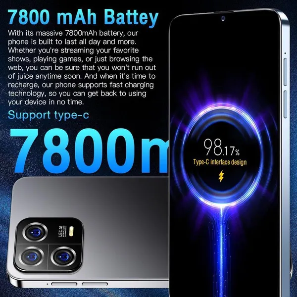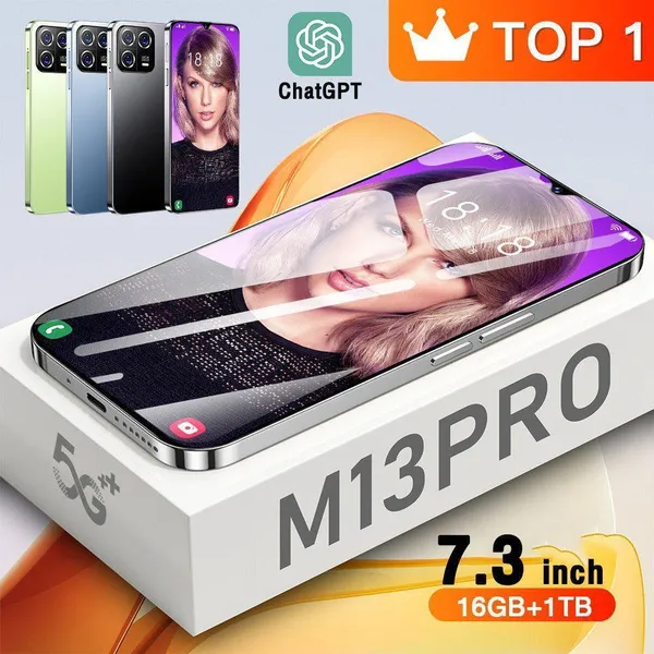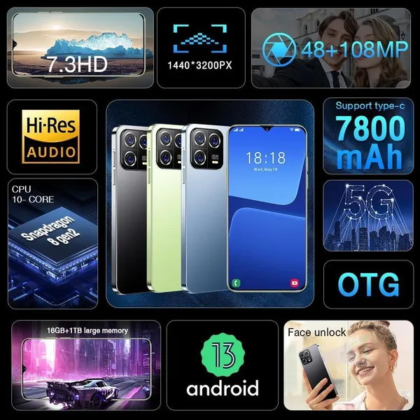 - 7.3inch Dewdrop Display The M13pro delivers the viewing experience you always wanted, With a massive 93% screen-to-body ratio on a 7.3inch screen. - 48MP Front Camera Clear and Stylish Selfie The M13pro world-leading 48MP front camera turns your every selfie into a work of art experience greater brightness, color vibrancy, clarity and dynamic range. Even in the dimmest light, whenever you need it, your M13pro is right there with you, capturing every moment with crystal-clear precision, Turn your selfies into masterpieces and shine in every photo. - 108MP Rear HD camera The M13pro features a 108MP camera combination. The main camera sports a large f/1.8 aperture and 1.28um pixels, This strong combination boosts photo-sensitivity in backlight or low light, Just point and shoot, and M13pro will make sure your pictures remain clear and bright. - Face Access The M13pro also supports facial recognition upon activation,M13pro scans your facial features and unlocks instantaneously accessing your phone has never been so easy, or so fun. - Powerful Performance The Snapdragon 8 gen2 mobile platform with 10mm process technology makes young people who love the young and other popular games. The game is on and lower. - Android 13.0 The new interactive design makes the operation simple and simple, the use of the mobile phone is so simple and straightforward, everything is handy. - Dual SIM card supports TF card Dual card dual standby, card slot does not distinguish between the main and the deputy, supporting the worlds 50 major communication carrier networks Specification: 1.Model No.:M13pro 2.Platform : Snapdragon 8 gen2, Deca Core (Latest 10 Core) 3.Standby: Dual sim dual standby 4.Screen: 7.3 HD+ Full Display 1440*3200 5.Speaker: 1511 Box Speaker 6.Frequency: GSM850/900/1800/1900MHz, 3G: WCDMA850/1900/2100MHz,4G LTE,5G 7.Vibration: Support 8.Colors: Black/Green/Blue 9.Memory: 16GB RAM+1TB ROM 10.Multi Media: MP3/MP4/3GP/FM Radio/Bluetooth 11.Camera: 48MP+108MP 12.Multi Function: Full screen, Face recognition, Dual SIM, Wi-Fi, GPS,Gravity Sensor, Alarm ,Calendar ,Calculator ,Audio recorder ,Video recorder, WAP/MMS/GPRS, Image viewer,E-Book,World clock,Tasks card, rear flash 13.Languages: Muti-language support 14.Others: Android OS 13.0 System 15.Battery: 7800mAh Lithium-ion battery 16.Ultra unibody 17.TypeC input Package Included: 1 x Smartphone, 1 x Charger Adapter, 1 x Headphones, 1 x User Manual, 1 x phone case, 1 x Protection film 1 xEpen look out Due to differences in lighting, the actual color of the phone may differ slightly from the screen and images. The color name is only used to distinguish individual SKUs. Please understand this. Thank you. The battery capacity is typical data for factory laboratories, and the specific charging speed, usage time, and other data may vary slightly depending on the power cord, power adapter, and ambient temperature. When the phone is completely turned off and automatically turned off, you need to charge the phone for more than 10 minutes before it can be turned on. It is recommended to charge when the battery level is below 20%. The available memory capacity depends on the pre installed software Product images and models, data, functions, performance, specifications, etc. are for reference only. We may make improvements to the above content. For detailed information, please refer to the product and product description. Unless otherwise specified, the data contained on this website is our internal test results and is compared with our products. Mobile phones do not support telecommunications CDMA
