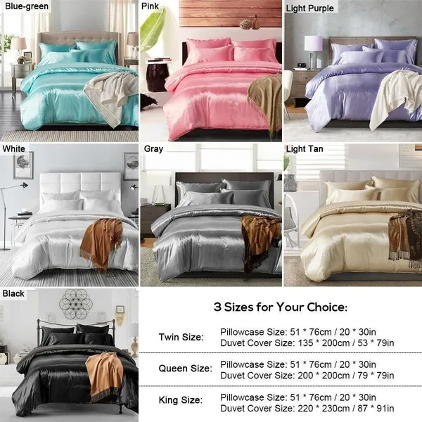 This silky smooth cozy bedding set ,They are well made and the silk-like polyester is nice touch and feels good, which is very comfortable for sleeping. The single color bedding set are easy to match with other home textiles, which really looks great on the bed and brightens up your room nicely. Features: Decent quality with reasonable price. Easy to insert and remove the inserts. Made of soft and breathable materials. Snug and textured, very comfortable for using. Specifications: Color: Black /Grey/white/purple/red/Camel/blue&green Size: Single Size /Twin Size / Queen size/King Size (Optional) Material: Polyester Single Size:1x Duvet Cover(150 x 200cm / 59.1 x 78.8in ) Twin Size:1x Duvet Cover(150 x 200cm / 59.1 x 78.8in) 1x Pillowcase(48 x 74cm / 18.9 x 29.2in) Queen size:1x Duvet Cover(200 x 230cm / 78.8 x 90.6in) 2x Pillowcase(48 x 74cm / 18.9 x 29.2in) King Size:1x Duvet Cover(220 x 240cm / 86.7 x 94.6in) 2x Pillowcase(48 x 74cm / 18.9 x 29.2in) Note: Pillow cover only, pillow is not included. Duvet cover only, comforter is not included. Single Size without pillowcase (only 1x Duvet Cover),the Twin Size only contain 1 pillowcase,the queen/king size contain 2 pillowcases Item color displayed in photos may be showing slight difference on your computer monitor since monitors are not calibrated same. Please in kind prevail. Please allows a slightly dimension variation due to manual measurement, thanks.